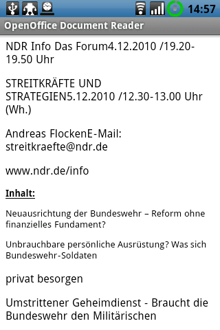 | Open Office ist eine vollwertige und kostenlose Alternative zum Microsoft Office und daher durchaus beliebt bei Leuten die für ein paar Briefe nicht mindestens 100€ ausgeben oder eine illegale Kopie einsetzen wollen. Es soll auch einige Firmen geben die rechnen können… Mit dem OpenOffice Document Reader gibt es aber zumindest ein Anzeigeprogramm mit dem man sich Dokumente im Openoffice Format auf dem Mobiltelefon ansehen kann. Das wird auch die wichtigste Funktion sein, die wenigsten dürften auf dem Telefon auch Text bearbeiten. Das macht der Reader auch ganz ordentlich was normale Texte angeht, bei meinem ersten Beispieldokument mit aktivem Inhaltsverzeichnis hatte es aber Probleme. Von daher nicht perfekt aber besser als nichts und ein Anfang, mehr wird kommen, da bin ich mir sicher. |