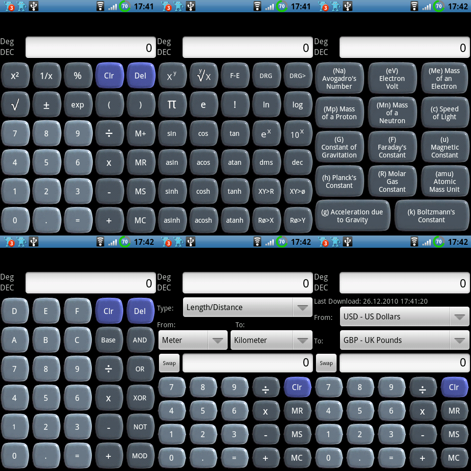 | Einen Taschenrechner bringt Android mit, der reciht für den Hausgebrauch auch völlig aus. Wer mehr will sollte sich All-in-1-calc ansehen. Zwischen den Oberflächen wechselt man bequem durch wischen zur Seite. Der universelle Standardschirm ist auf der Screenshotcollage oben links, von Links nach Rechts kommen dann die anderen Oberflächen in der Reihenfolge wie sie erscheinen wenn man immer nach Links wischt (also den nächsten rechten Bildschirm). |