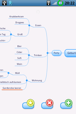 | Thinking Space ist eine Freemind-kompatibele Mindmapping Anwendung. Mindmapping ist ein Hilfsmittel um seine Gedanken zu ordnen. Man kann es sich vorstellen wie einen dynamischen Schmierzettel auf dem man sich Stichworte notiert und die automatisch in Bezug gesetzt werden. Praktisch funktioniert das so dass man ein Stichwort aufschreibt und dazu dann weitere die einem in den Sinn kommen. Gehört das neue Stichwort zu einem anderne markiert man das andere vorher, das Programm setzt sie automatisch in Beziehung. Nach und Nach erhält man so einen Beziehungsbaum zu dem Thema zu dem man sich Stichworte notiert. Wie man dabei genau vorgeht und nach welcher Logik bleibt einem dabei selbst überlassen. Man tut es einfach, das sorgt auch dafür dass die Struktur der eigenen Logik entspricht. Ich bin selbst Anfänger auf dem Gebiet, aber das ist es was ich mir so angelesen habe. Mindmaps erstellt man auf dem Computer zum Beispiel mit dem kostenlosen FreeMind oder/und auf dem Android Telefon mit Thinking Space. Es geht beides weil Thinking Space praktischerweise die FreeMind Dateien verarbeiten kann. Ich persönlich finde es auf dem Telefon praktischer weil ich etwas notieren kann in dem Moment in dem es mir einfällt und mich nicht konzentriert an den Computer setzen muss. Dabei vergisst man eh die Hälfte |