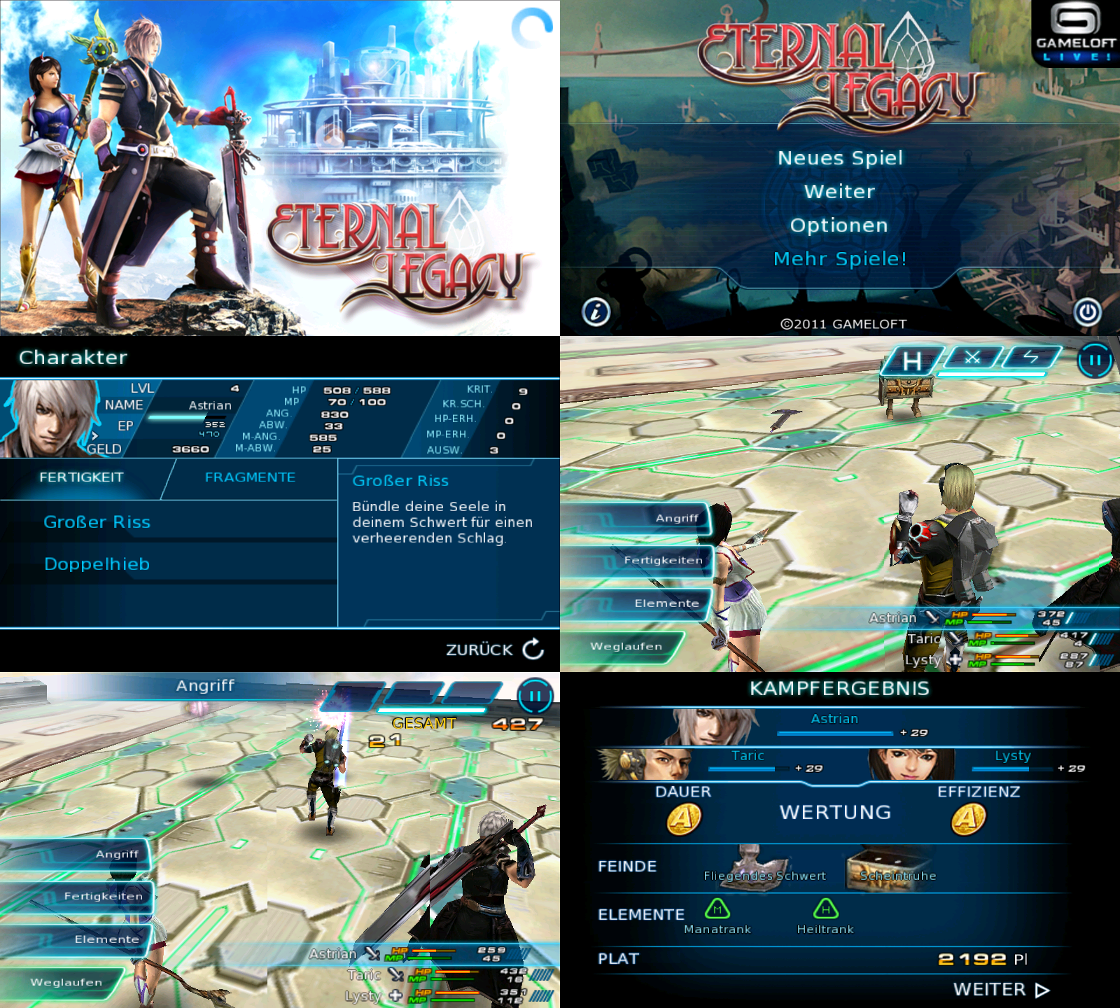 | Auch Eternal Legacy ist ein Rollenspiel, im Unterschied zu Dungeon Hunter aber ein asiatisches. Das macht sich zum Einen im Grafikstil bemerkbar, zum Anderen aber auch in der Art wie gespielt wird. Hier ist der Spielverlauf wesentlich linearer, man spielt quasi eine Geschichte nach. So zeigt einem ein Pfeil ständig an in welche Richtung man gehen muss. Auch hier müssen Aufgaben erfüllt werden, man wird durch den Pfeil halt geführt. Natürlich läuft man nicht nur dem Pfeil nach, ständig müssen Gegner bekämpft und besiegt werden. Das geschieht hier aber grundsätzlich anders als bei westlichen Rollenspielen wie Dungeon Hunter. Dort haut man einfach drauf, hier agiert man eher taktisch: Aus drei Kategorien wählt man die Aktionen aus die ausgeführt werden sollen. Angriff auf Gegner 1, besondere Fähigkeit 3 gegen Gegner 2 usw.. Die Aktionen werden sofort ausgeführt, bis zu drei kann man im vorraus festlegen. Es aber nicht rundenbasiert, es geht ständig zur Sache. In diesem Stil spielt man einfach gesagt einen Film nach, was natürlich nur klappt wenn man auch erfolgreich ist. Das Spiel ist wohl stark an der Final Fantasy Reihe orientiert, da ich die aber nie gespielt habe kann ich nicht näher sagen welcher Teil die Hauptinspiration war. Wenn man die Richtung mag ist Eternal Legacy aber eine sichere Wahl, auch wenn ich eher zu den westlichen Actionrollenspielen neige macht EL mir Spaß. Wenn man nur ein Spiel kaufen will würde ich einfach danach gehen welche Richtung mir eher liegt. Und natürlich noch der Trailer: Youtube Direktlink