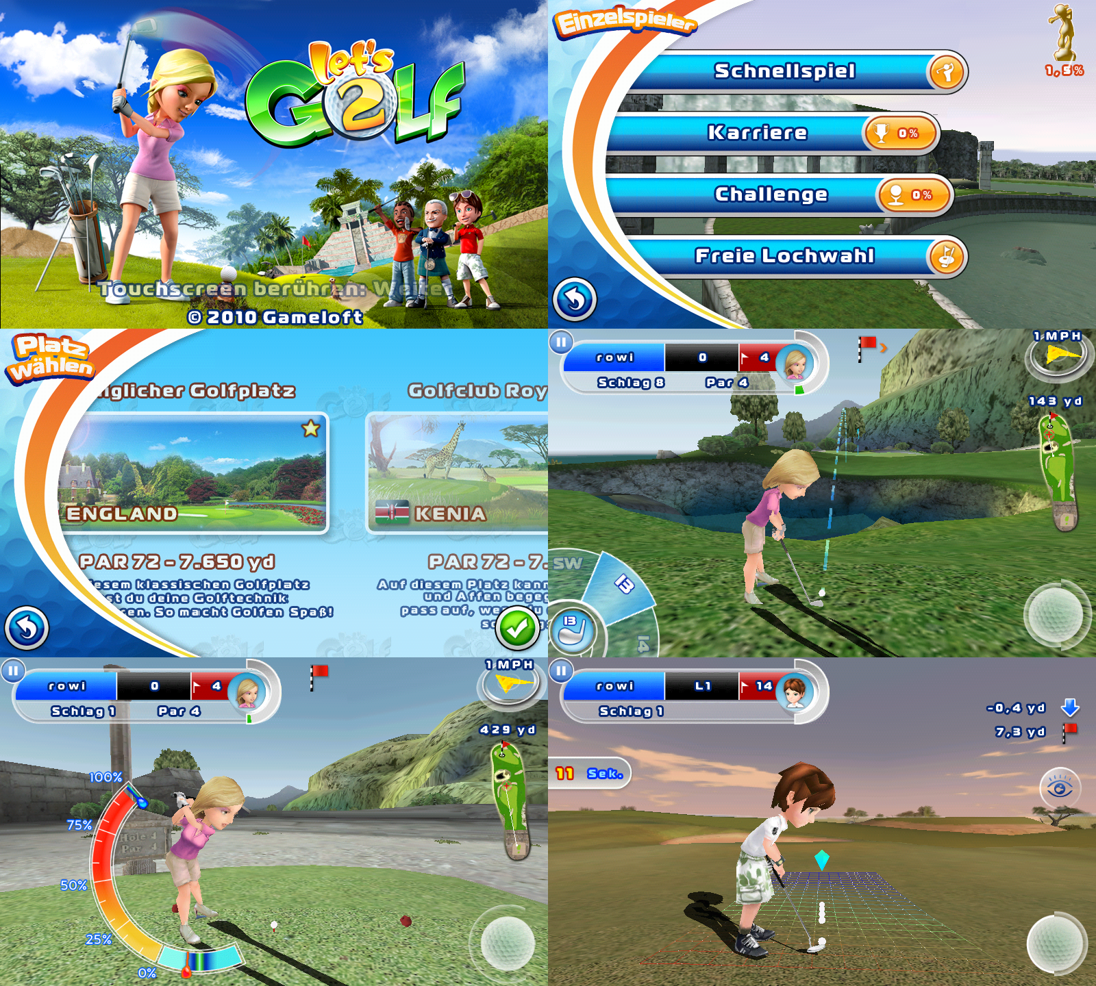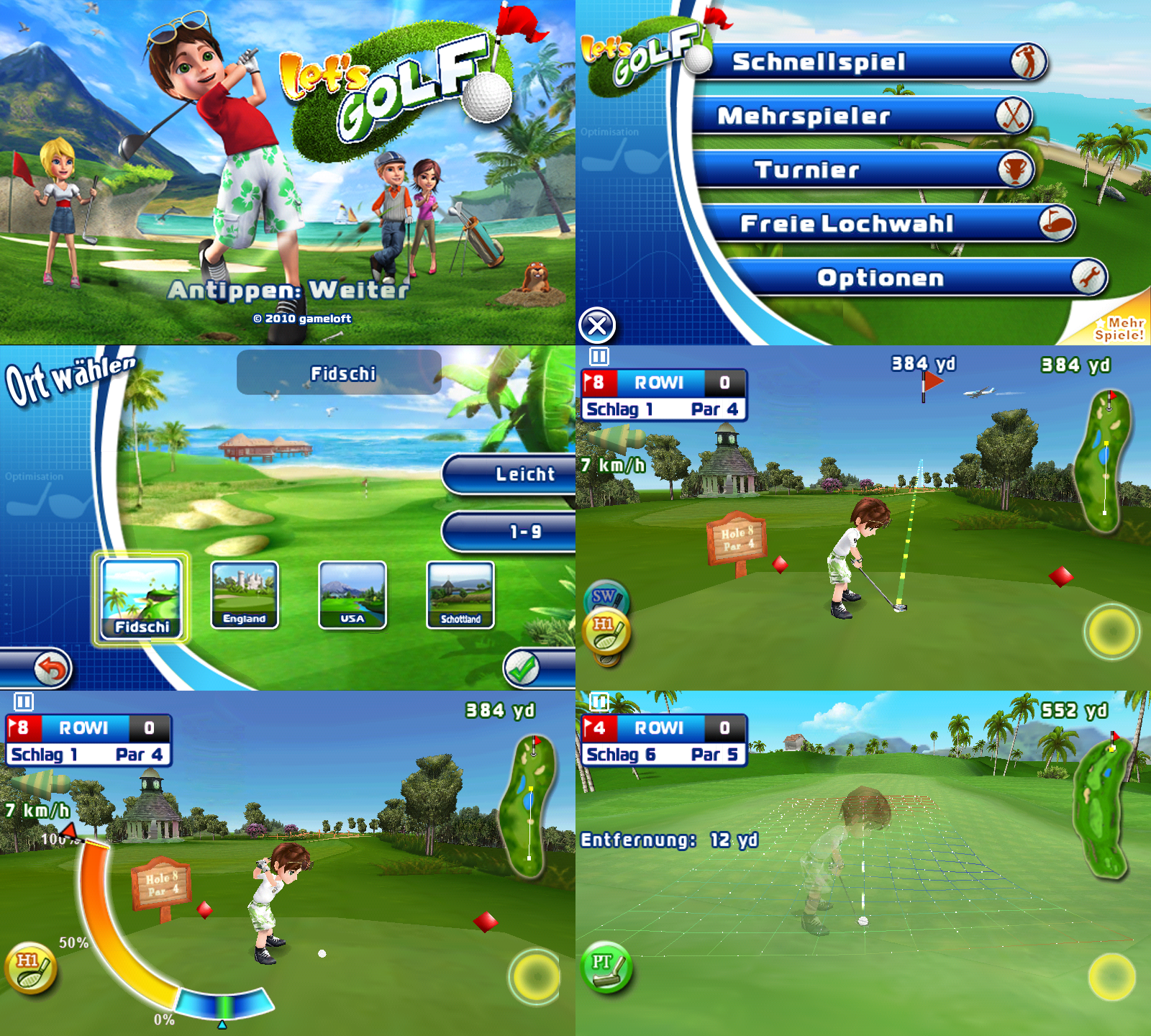 | Let’s Golf! 2 HD ist ein 3D Golfspiel (wer hätt’s gedacht Im Einzelspielermodus hat man die Wahl zwischen einem Schnellspiel über drei Löcher, einem Karrieremodus, einer Challange und freier Lochwahl. Bei der Challenge muss man verschiedene Aufgaben erfüllen, wie einen schweren Birdie schaffen. Im Karrieremodus schaltet man mit seinen Erfolgen weitere Golfplätze, Charaktere, Outfits und Ausrüstungsgegenstände frei. Im Mehrspielermodus kann man über den Onlinedienst Gameloft Live! gegen andere Menschen spielen. Dabei kann man entweder einem existierenden Turnier beitreten oder selbst eines starten. Im eigentlichen Spiel wird zuerst der Platz im Überflug gezeigt (kann man überspringen) und anschliessend steht man am Abschlag. Unten Links kann man einen Schläger wählen, wobei der passende Schläger um den Kurs par zu spielen schon vorgewählt ist. Auch die Richtung passt schon dafür, man kann also gleich loslegen. Oder man wirft einen Blick auf die Übersichtskarte oben rechts und sucht sich seinen eigenen Weg. Den angepeilten Schlag kann man auf dem Touchscreen intuitiv mit dem Finger anpassen. Die ungefähre Flugbahn entsprechend dem gewählten Schläger wird dabei ständig angezeigt. Mit dem Golfball unten rechts startet man den Schlag, erst wird die Stärke festgelegt, dabei bewegt sich ein Marker einer Skala entlang, eine optimale Stärke ist dabei angezeichnet. Mit einem weiteren Druck im richtigen Moment legt man die Schlagstärke fest. Anschliessend wird eine weitere Skala eingeblendet mit der die Präzision definiert wird. Hier muss man möglichst die Mitte treffen. Anschliessend wird der Schlag ausgeführt und sehenswert dreidimensional animiert. Und weiter geht’s bis man auf dem Grün ist. Hier wechselt das Spiel automatisch ins putten wo nur noch die Richtung und Schlagstärke festgelegt werden muss. Let’s Golf 2 HD macht wirklich Spaß, auch wenn ich bisher fast nur das Schnellspiel genutzt habe für ein paar schnelle Löcher zwischendurch. Und hier natürlich auch noch der Trailer: Youtube Direktlink