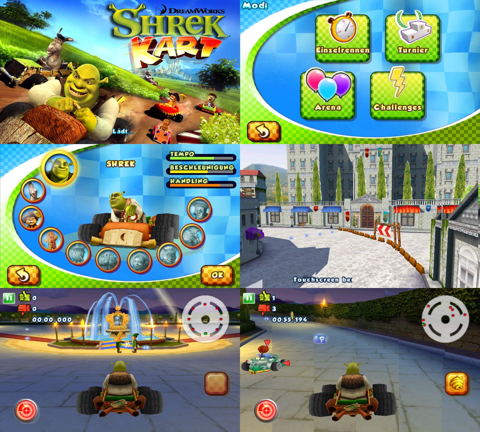 | Shrek Kart ist ein Funracer der mit seinem Namen eigentlich schon alles beschreibt bzw. andeutet: angesiedelt in der Welt von Shrek ist es ein Spassrennen ala Mario Kart. Das Spiel wird als Einzelspieler gespielt in den Modi Sofortrennen, Turnier, Challenge (mit Geschicklichkeitsübungen) und Arena (freies fahren gegeneinander). Als Fahrer stehen praktisch alle Spielfiguren der ersten beiden Shrek-Filme zur Verfügung die jeweils unterschiedliche Fahrzeuge und Charakteristiken haben. Das ist in diesem Genre aber eher nebensächlich, wenn auch nicht ganz egal. Die Grafik ist gut und schnell, auch hier zu schnell um einen sauberen Screenshot zu machen. Untermalt wird es von einem stimmigen Soundtrack aus den Filmen. Das Spiel macht sehr viel Spaß, wünschen würde ich mir einen Mehrspielermodus bei dem man via WLAN oder Bluetooth gegeneinander antreten kann. Und der offizielle Trailer: Youtube Direktlink