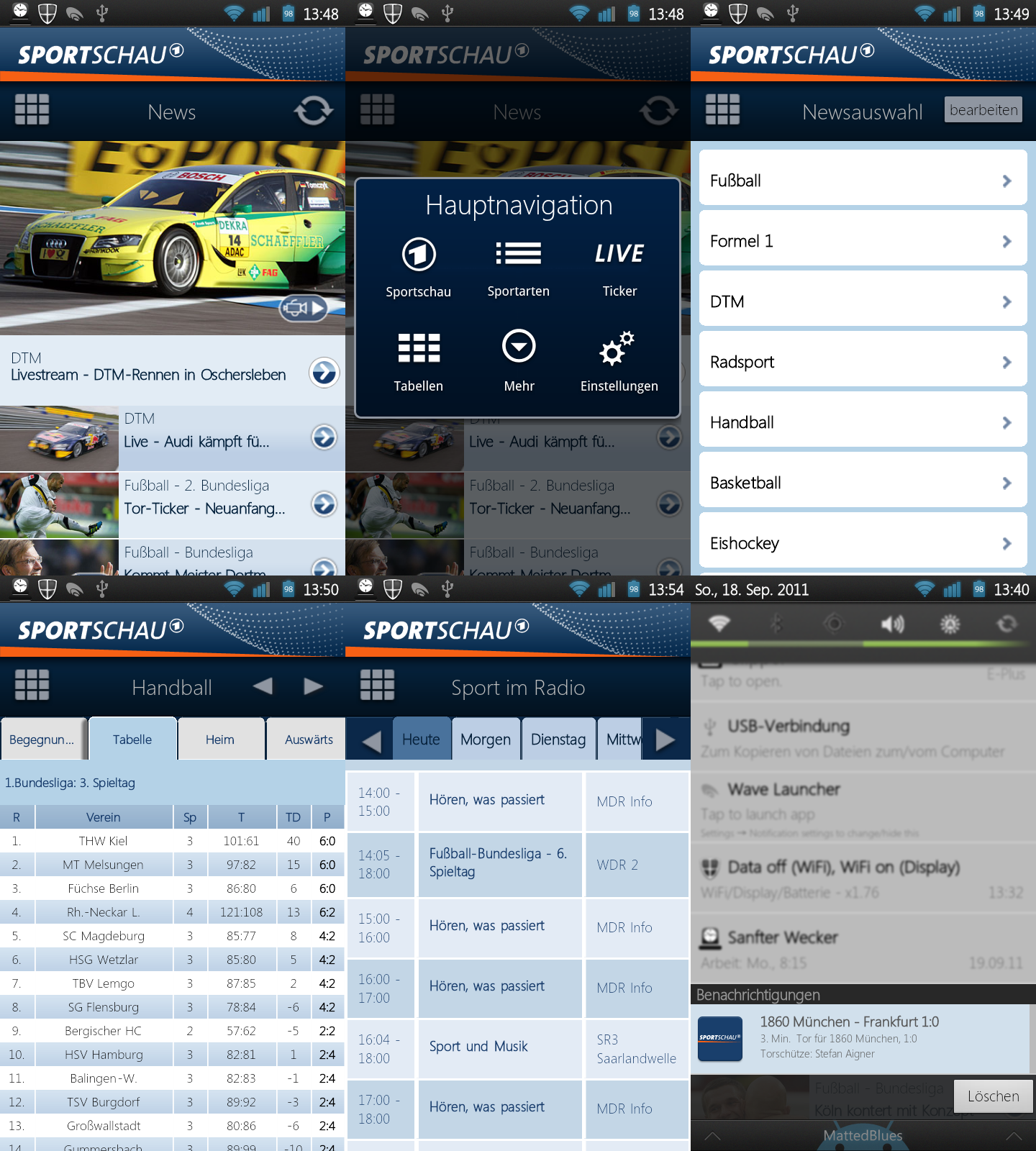| Wie bleiben bei öffentlich-rechtlichen Programmen, vor zwei Tagen ist auch die Sportschau im Market angekommen. Und die macht fast alles richtig. Man wird empfangen mit einer Nachrichtenübersicht mit Text- oder Videonachrichten oder Bildergalerien. Am Wochenende ist dieser Teil natürlich sehr Fussballastig, aber weiter unten finden sich z.B. auch Videobeiträge der DTM und der Paralympics. Über das 9-Punkte-Quadrat oben oder die Menütaste erreicht man die Hauptnavigation in der man die Sportarten auch direkt auswählen (diese Liste lässt sich auch bearbeiten) und Tabellen ansehen kann sowie zum Live-Ticker. Hier kann man auch einen Tor-Alarm aktivieren durch den man bei jedem gefallenen Tor informiert wird. Den scheint es aber nur für Fussball (1. und 2. Liga) zu geben. Was positiv auffällt: Die App ist wirklich für Android entwickelt bzw. angepasst: Der Toralarm ist kein Pop-Up das den Bildschirm blockiert wie es beim iphone (noch) nötig ist sondern es gibt eine Vibration, man hört ein “Tooor!” und ein Sportschau-Icon in der Benachrichtigungsleiste. Zieht man sie runter liest man in der Benachrichtigung das Spiel, den Spielstand, wann das Tor gefallen ist, für wen und den Torschützen. Auch gibt es keine “zurück” Schaltfläche auf dem Bildschirm wie sie beim iphone nötig ist, die Hardware-Taste funktioniert wie gewohnt und es sein sollte. Drückt man auf der Startansicht ‘zurück’ ist man raus aus der App. In der Hauptnavigation erreicht man unter “Mehr” einen Programmplan mit den nächsten Sportsendungen der ARD sowie im Radio, hat direkten Zugriff auf alle Ton- und Videobeiträge und die Bildgalerien. Auch kann man hier seinen Lieblings (Fussball-) Verein auswählen der in den Tabellen und Spielergebnissen dann markiert wird. Die Sportschau App ist wirklich gut gemacht. |