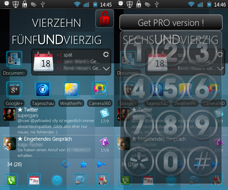 | Da hat man seinen Homescreen mit Widgets übersichtlich gestaltet und sieht auf einen Blick alle relevanten Informationen. Um diesen Blick zu erhaschen muss man aber meist am Sperrbildschirm vorbei. Statt diesen auch Informationstechnisch aufzurüsten kann man ihn auch einfach abschalten. Zumindest mit hidden lock. Das Programm ersetzt den Sperrbildschirm durch einen durchsichtigen und zeigt statt dessen die normale Standby-Ansicht. Natürlich ist der Bildschirm weiterhin gesperrt, zum entsperren dient entweder ein entsprechendes Icon das von der Größe und Position her einstellbar ist (auf dem Screenshot oben Rechts) oder eine Pin-Abfrage. die Zahlentastatur wird dabei ebenso wie das Entsperricon erst eingeblendet wenn man einmal auf den Schirm tippt, man hat normalerweise also freien Blick auf seinen Standby-Bildschirm. In der kostenlosen Version ist die PIN-Länge auf maximal 4 Zahlen begrenzt und das Tool startet nicht automatisch beim Telefonstart. Allerdings ist die Vollversion mit 73 Cent auch erfreulich günstig. |