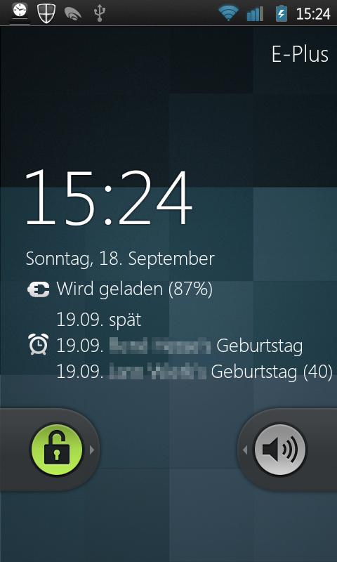 | Oft weckt man sein Telefon nur auf um schnell etwas nachzusehen. Ganz banal: die Uhrzeit. Bei Smartphones aber auch oft um auf den Kalender zu blicken. Und für diesen Zweck kommt einem das Telefon mit dem lockscreen calender auf halben Weg entgegen: es blendet die nächsten Termine auf dem Sperrbildschirm ein, so dass man wirklich nur einmal kurz den Bildschirm wecken muss, aber nicht das Telefon voll entsperren. Dabei lässt sich auswählen wie viele Termine angezeigt werden sollen (mehr als 3 können die Entsperrschieber aber beeinträchtigen) und wie weit in die Zukunft Termine angezeigt werden sollen. Leider lässt sich die Terminanzeige nicht mit anderen Tools kombinieren, was wohl aber eher eine Android Einschränkung ist, so dass ich mich entscheiden muss zwischen dem lockscreen calendar und Besitzer (aus Folge 17). Wer noch mehr Informationen auf dem Sperrbildschirm haben will sollte sich auch den Executive Assistant (aus Folge 60) ansehen. |