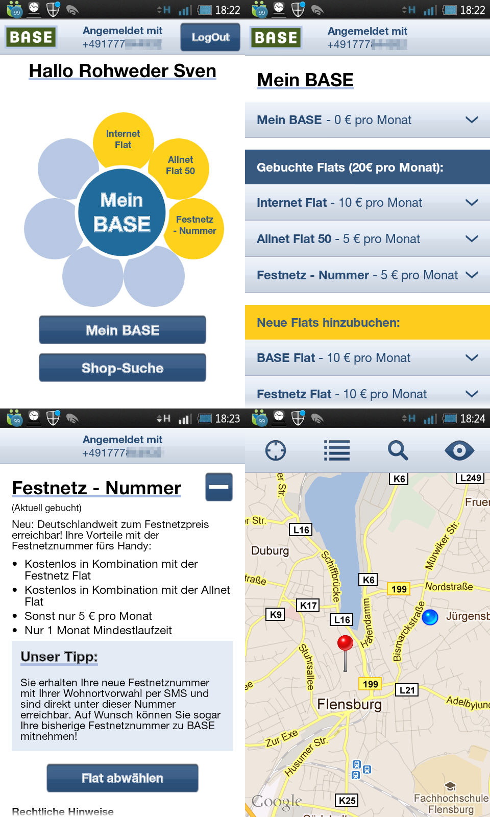 | Da ich seit meinem Tarifwechsel letzte Woche nun offiziell auch Base-Kunde bin konnte ich mir auch mal die Android-App von Base ansehen. Die Base-Tarife sind alle als Flatrate bzw. Minutenpakete organisiert die man monatlich wechseln kann. Und das geht direkt am Übeltäter mit der Base-App. Man kann sich natürlich seine gebuchten Flatrates ansehen und auch alle anderen die angeboten werden, jeweils auch mit Detailinformationen. Auch das buchen bzw. abbestellen geht damit sehr einfach. Hat man das Bedürfnis einem Menschen gegenüber zu stehen zeigt die App auch noch die nächstegelegenen E-Plus bzw. Base-Shops auf einer Karte an, mit Adresse und Zielführung. Was leider (noch?) nicht geht ist sich weitere Informationen anzusehen. Man sieht seine monatlichen Kosten durch die gebuchten Flatrates, natürlich auch was die anderen kosten, aber leider ist der Dienst “CostControl” ebensowenig integriert wie weitere Details. Ich sehe also nicht was für Kosten im aktuellen Monat neben neben den Grundkosten aufgelaufen sind und auch kann ich z.B. nicht meine gebuchte Festnetznummer nachsehen. Da ist also noch “Luft nach oben”, zum dynamischen Flatrate ändern funktioniert sie aber sehr gut und das ist ja der Hauptargument der Base-Tarife. |