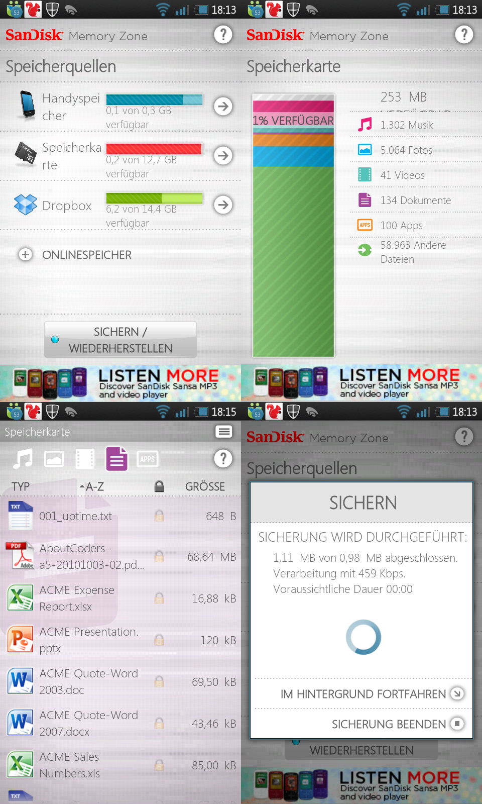 | Die SanDisk Memory Zone vom gleichnamigen Speicherkartenhersteller ist ein Verwaltungs- und Backuptool. Neben dem analysieren kann das Tool auch noch Backups der Dateien machen, und zwar zwischen den verschiedenen eingerichteten Speicherorten. Also z.B. aus dem internen Handyspeicher die Kontakte auf die SD-Karte oder Dropbox sichern. Oder umgekehrt oder welche Kombination man auch immer mag. Die Backups kann man auch automatisch im Hintergrund ausführen lassen. Die so gesicherten Dateien lassen sich dann auch wieder herstellen. Das Tool ist recht praktisch und vor allem sehr übersichtlich, mir ist es allerdings nur gelungen meine Dropbox einzurichten, Google Docs und Picasa scheiterten am angeblich falschen Passwort. Den zugrundeliegenden Google-Account möchte es hier offenbar nicht, vielleicht bekomme ich das aber noch raus. Box habe ich nicht ausprobiert, dort habe ich keinen Account. |
