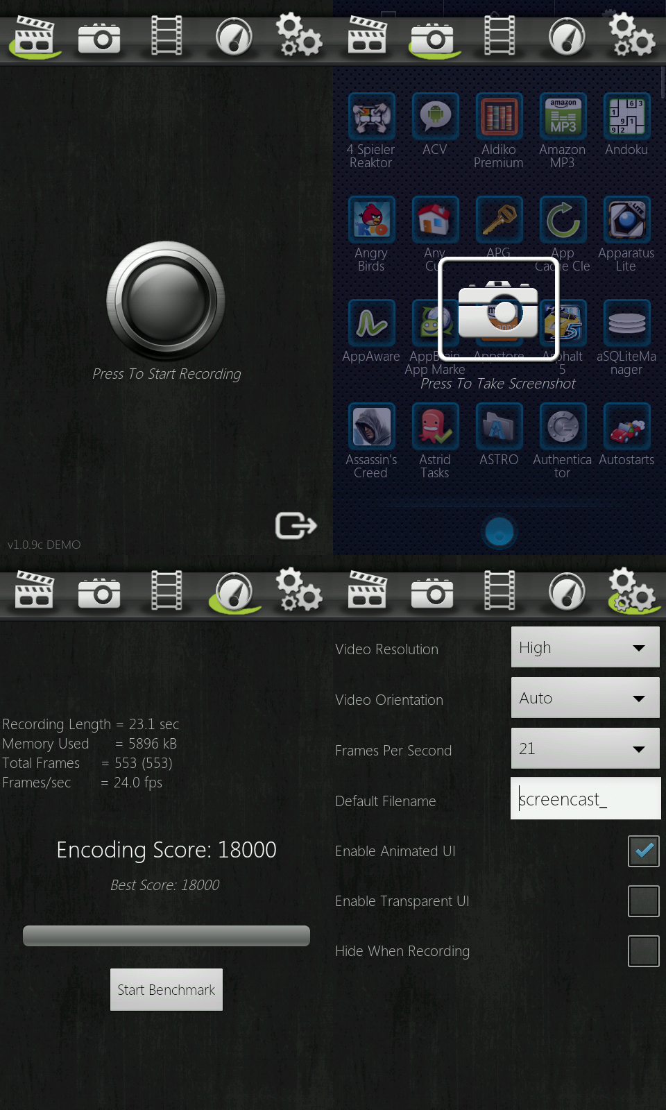 | Screenshots, Bildschirmfotos, vom Android-Schirm zu machen ist eine der meist vermissten Funktionen — zumindest bei Bloggern Damit das funktioniert benötigt man bzw. das Tool root-Zugriff, dann steht dem Hobbyfilmer aber nichts im Wege. Man kann wählen zwischen zwei Qualitätsstufen und auch die Framerate. Ein Benchmark ist eingebaut, mein Desire schafft auch in der hohen Auflösung 21fps, damit kann man schon gut Filme erzeugen. Ich bin nicht sicher ob sich das Programm anhand des Benchmarks konfiguriert, ich würde ihn zur Sicherheit einfach einmal durchlaufen lassen. |