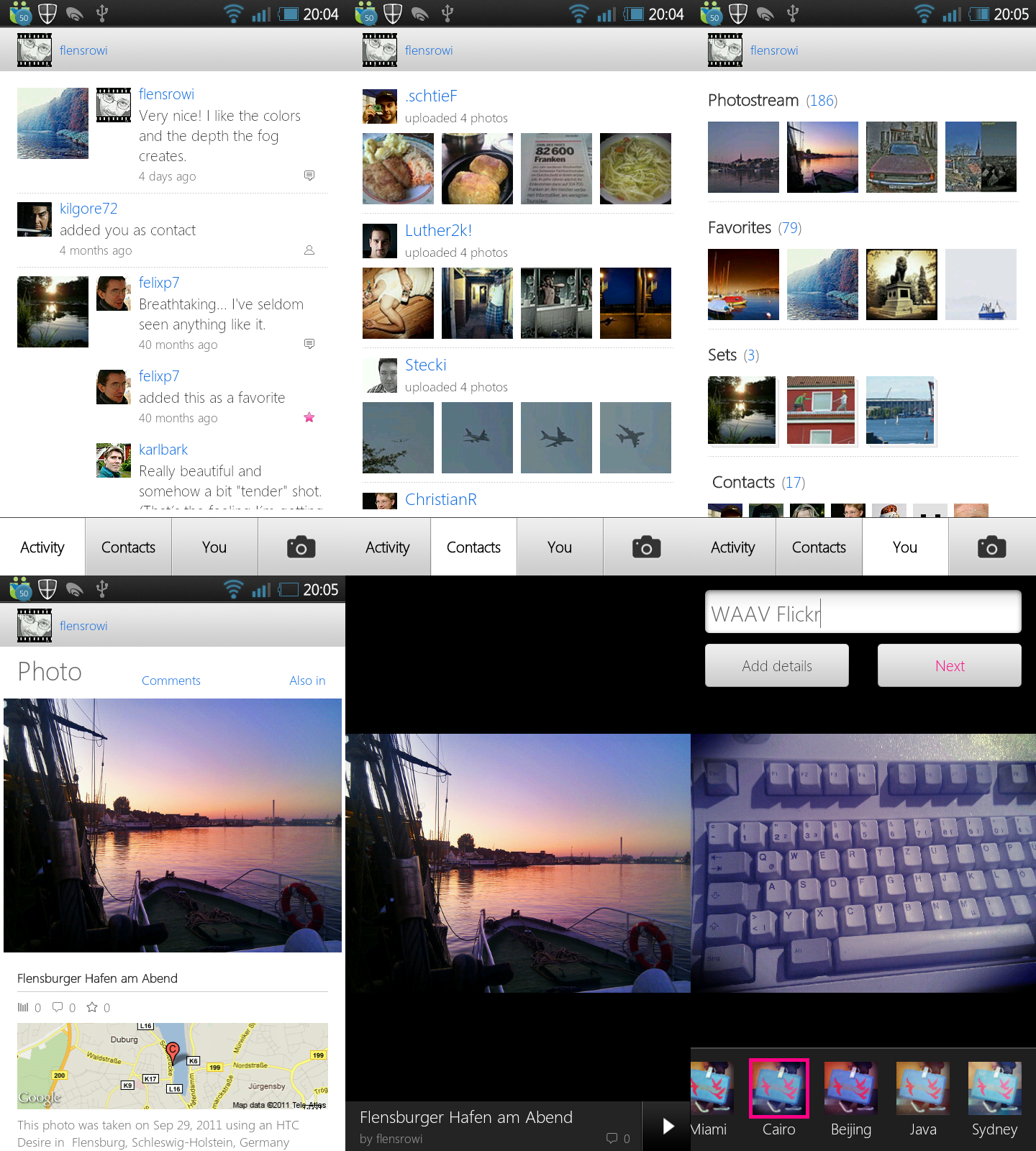 | Mit flickr bietet gleichnamige Foto-Webseite nun auch eine Android Anwendung an. Und die Umsetzung gefällt mir. Wie auf der Webseite wird man in einer zufälligen Sprache begrüsst und landet in der Anzeige der letzten Aktivitäten. Über Kartereiter springt man zu den Kontakten und ihren Bildern. Unter “You” findet sich natürlich der eigene Photostream, die Favoriten, die eigenen Sets und noch einmal aufgelistet alle Kontakte. Natürlich lassen sich Bilder hier auch kommentieren, als Favorit markieren und über die share-Funktion von Android weiterleiten (der Link). Das deckt so ziemlich alles ab was flickr als Foto Webseite und Community ausmacht. Darüber hinaus kann man natürlich auch Bilder vom Telefon hochladen bzw. über eine integrierte Kamerafunktion aufnehmen und hochladen. Beim Hochladen kann man zudem auch noch einige Farbeffekte auswählen und optional gleichzeitig zu Facebook, Twitter, Tumblr oder per E-Mail weiterleiten. Ein gutes Debut, die App ist funktional praktisch vollständig und hat zudem noch Extras wie die Farbfilter beim hochladen. Sie sollte aber noch regionalisiert werden, momentan ist sie nur englisch. |