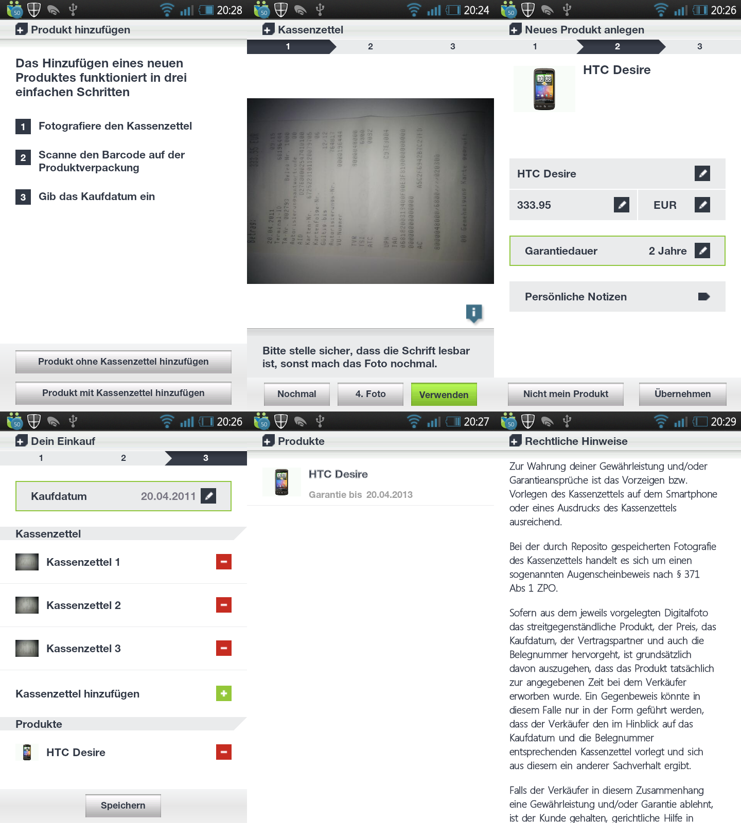 | Reposito dient zum archivieren von Kassenzetteln. Nicht für die Milch die Du gekauft hast sondern teurere Dinge wie das Smartphone das Du gerade in der Hand hälst. Oder Dein Fernseher, das Sofa. Diese eher teureren Dinge bzw. Dinge für die man evtl. die Garantie in Anspruch nehemn können will. Also auch der Eierkocher in der Küche. Das Problem ist zum Einen dass man nicht für alle Kassenzettel eine praktische Kassenzetteltasche bekommt und sie schlichtweg nicht wiederfindet, wenn man ihn gefunden hat stellt man dann aber fest dass das Thermopapier schon nach wenigen Monaten leer ist. Beides geht Reposito an indem es den Kassenzettel archviert so dass man ihn zum Einen wiederfindet und zum Anderen auch noch was drauf zu lesen ist. Dazu wird erst der Kassenzettel fotografiert und anschliessend der Strichcode auf der Packung des Geräts eingescannt. Beides zusammen wird archiviert — lokal und zur Sicherheit auch noch online, ein Webzugriff ist in Arbeit — und man kann im Garantiefall den fotografierten Kassenzettel vorweisen. Dass das gültig ist hat sich Reposito in einem Rechtsgutachten zusichern lassen, die Rechtsgrundlage ist auch im Telefon abrufbar damit der Händler es auch glaubt. Bei Bedarf kann man das Foto auch noch ausdrucken. Als Bonus kann man auch noch die Garantiezeit angeben (die Gewährleistung wird standardmässig erfasst) und demnächst soll man auch noch Garantieverlängerungen über den Anbieter buchen können. |