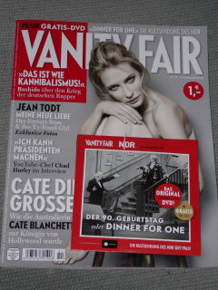 Ich habe es getan! Ich habe mir dies Promi-Klatsch-Magazingedingse gekauft. Und zwar nach einem Tipp auf Spiegel Online. Nein, was da drinsteht interessiert mich nicht, das Papier kommt nicht mal zum Zeitvertreib auf Klo. Ich hab nen Papiershredder den ich damit füttern kann. Wichtig ist, was draufklebt: Dinner for One auf DVD, und zwar in der NDR-Fassung, die normale Kauf-DVD ist die gräusliche Schweizer Fassung. Die will man wirklich nicht sehen.