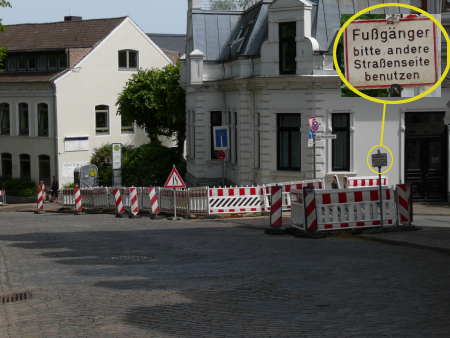 Man wird von der einen Baustelle in die Andere verwiesen. Immerhin hat man da einen guten halben Meter Platz zum Geländer und muss nicht über die Strasse (die 100m weiter in der Fussgängerzone endet).