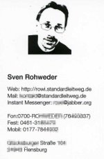 Die Seite mit den eigentlichen Daten (die Textseite) ist für alle Karten gleich, kann aber auch ein Foto sein bzw. mit einem Foto auf etwa 1/3 der Fläche versehen werden. Da habe ich erstmal mein Konterfei wie hier rechts auch im Blog zu sehen genommen. (Siehe links)