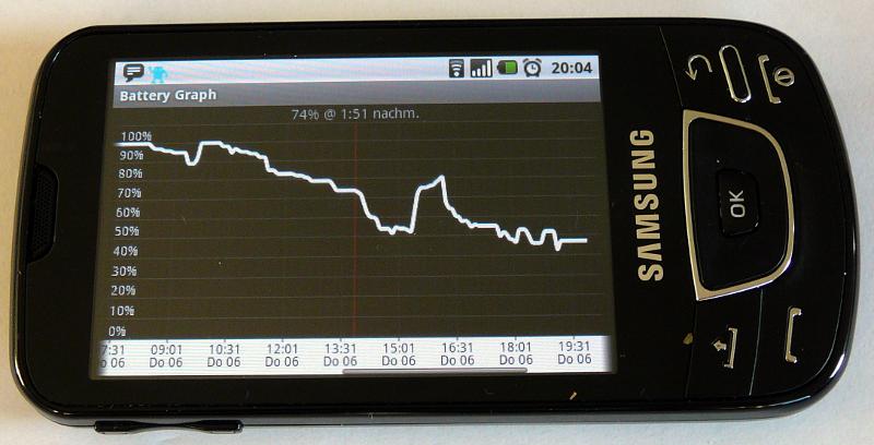 Battery Graph. Das kleine Tool ermittelt alle 5 Minuten den Ladestand und trägt es in eine Grafik ein. Entgegen der Warnungen beeinträchtigt es nicht merklich den Stromverbrauch, was aber bei anderen Batterie-Tools durchaus der Fall sein kann und scheinbar durchaus normal ist!