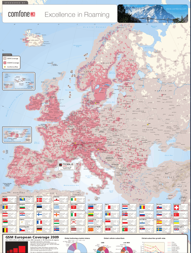 Das sind zum einen hochauflösende Abdeckungskarten für ganze Kontinte im PDF Format (Weltkarte ca 22MB, Europa ca. 15MB) und zum anderen nach Ländern sortiert interaktive Abdeckungskarten für fast jeden Netzbetreiber auf dem Planeten.