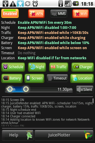 Und zwar beschreibt der Artikel “Es bleibe Licht – Power-Management mit dem Motorola Milestone“ auf MobiFlip sehr gut wie man mit JuiceDefender die Laufzeit des Akkus dadurch verlängern kann indem man den Datenverkehr stoppt sobald der Bildschirm aus ist. JuiceDefender aktiviert den Verkehr aber alle 15, 30, xx Minuten kurz damit Programme die sich im Hintergrund aktivieren weiterhin ihren Dienst tun. Die kostenlose Version hat feste, schon sehr gute, Werte; in der Bezahlversion UltimateJuice kann man die Parameter nach eigenen Wünschen anpassen und auch das WLAN automagisch ein- und ausschalten lassen wenn man in die Nähe bekannter WLANs kommt bzw. sich entfernt, wie ich es zuvor mit Y-5 getan habe.