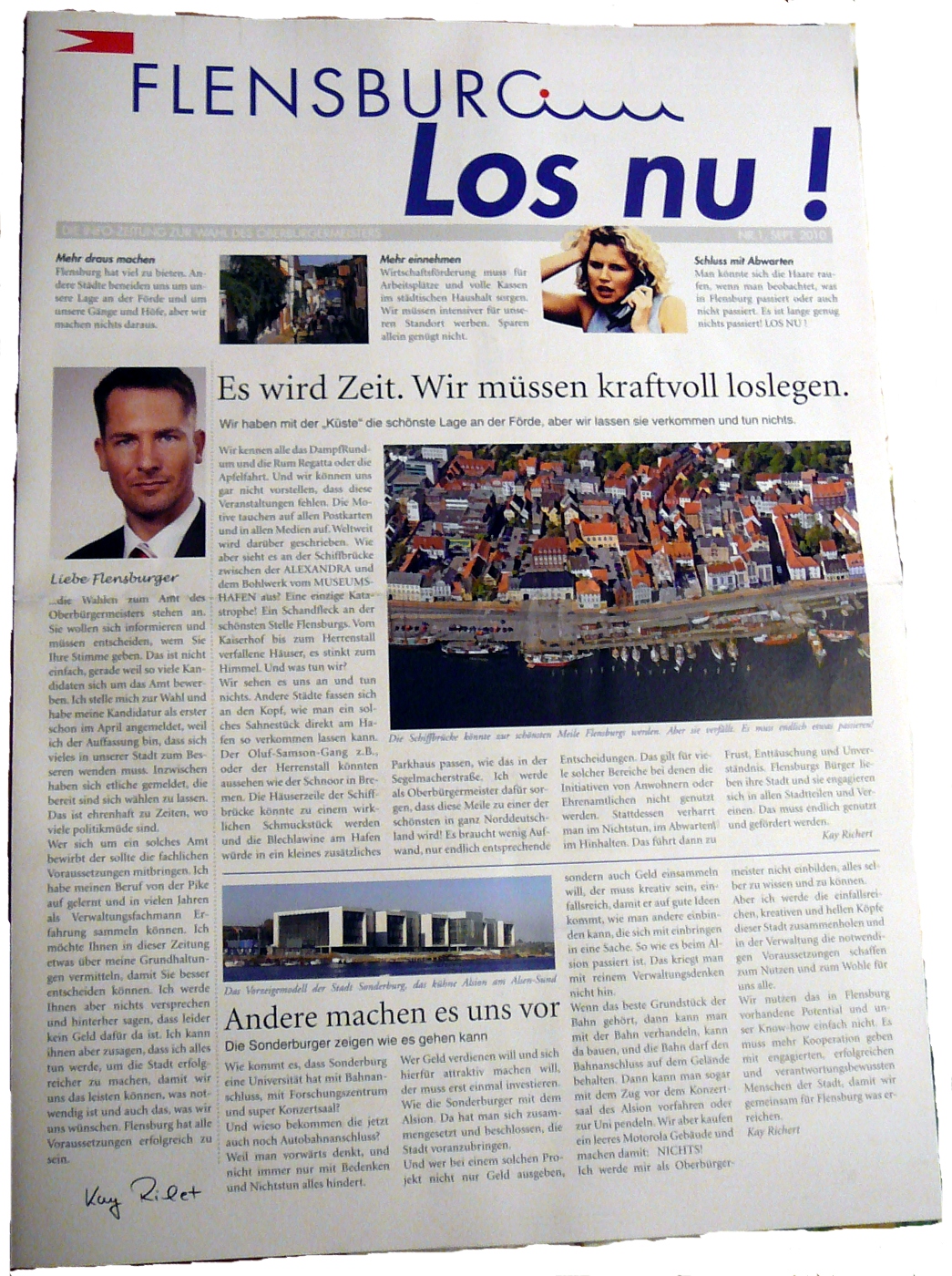 Das Flensburger Tageblatt hatte heute eine etwas andere Beilage: “Die Info-Zeitung zur Wahl des Oberbürgermeisters”. Die Wahl ist am 31. Oktober, die Zeitung trägt das offizielle Logo der Stadt.