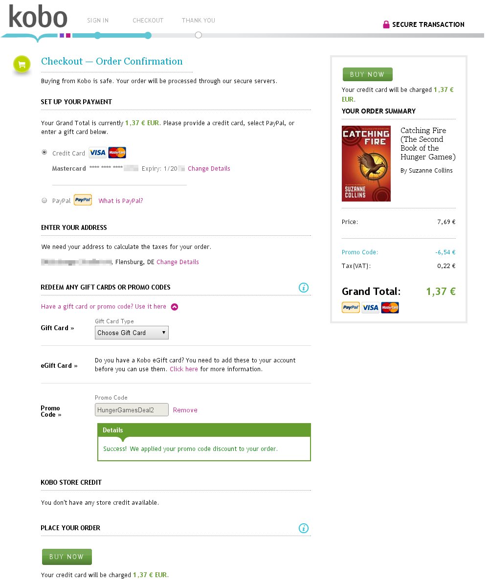Achtung: Man kann den Code offenbar nur einmal verwenden, will man also die Bücher einzeln kaufen klappt das nicht. Es gelten aber auch die Codes HungerGamesDeal2 und HungerGamesDeal3