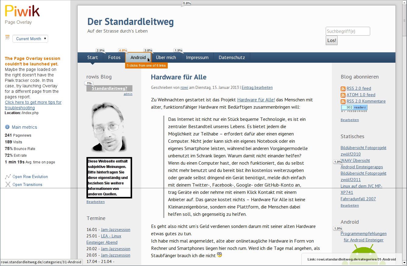 Besonders das Seiten-Overlay finde ich sehr cool, Piwik öffnet ein zweispaltiges Fenster mit einem Informationsbereich und direkt in der Seite bei jedem Link die Information wie viele Besucher in Prozent und absoluten Zahlen auf den Link geklickt haben:
