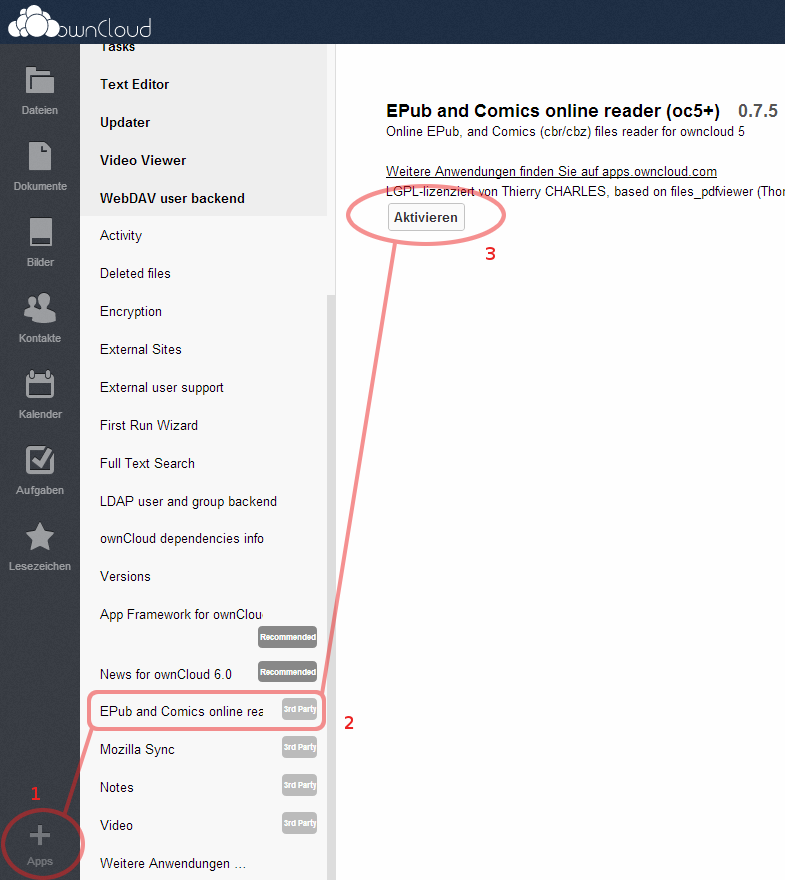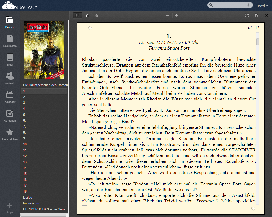 Für ownCloud(Notiz für mich: über ownCloud bloggen) gibt es eine App mit dem passenden Namen EPub and Comics online reader. Und die tut genau das, was der Name sagt. Die Installation ist recht einfach: die App herunterladen, das Archiv auspacken und auf dem Server in das “apps” Verzeichnis der ownCloud installation hochladen. Anschliessend unten Links auf “Apps” klicken und den EPub and Comics online reader aktivieren. Das war es auch schon, fortan werden alle .ePub und .cbz Dateien im eBook Reader geöffnet. Der beherrscht Inhaltsverzeichnisse, hat eine Vollbildansicht, kann die Schriftgrösse ändern (nicht aber die Schriftart) und Lesezeichen setzen.