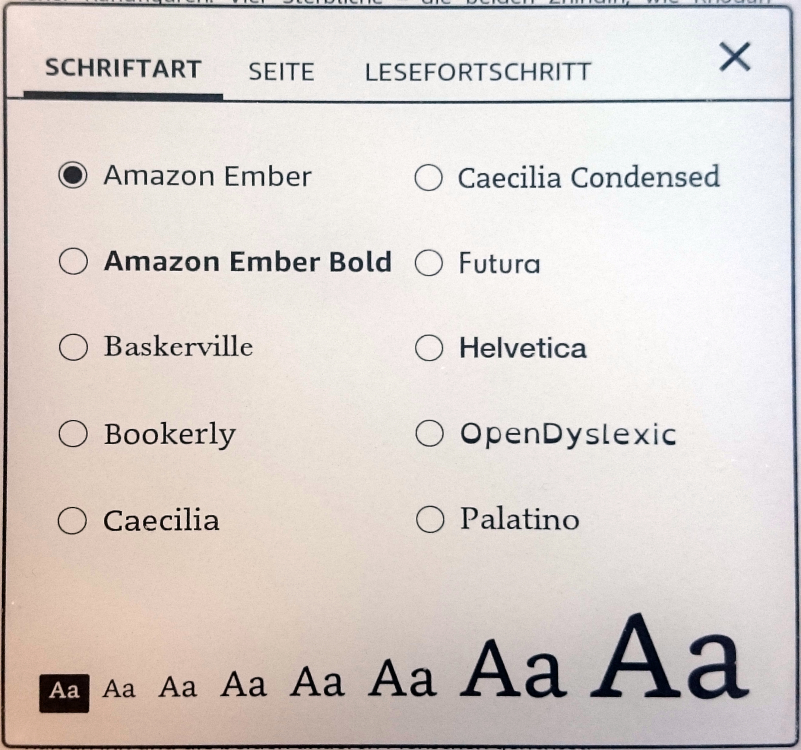 Mit der Schriftart Ember, in der ich seit zwei Wochen lese, gewinne ich bei kleinster Größe so nur eine Zeile, bei den anderen Schriften und -größen ist es deutlicher. Da werde ich wenn ich Zeit habe noch mal etwas experimentieren, mein Ziel ist es, die kleinste Einstellung wirklich minimal für die Auflösung des Paperwhite 3 zu haben und vielleicht die zweitkleinste in etwa so wie jetzt die kleinste Größe. Ich werde berichten