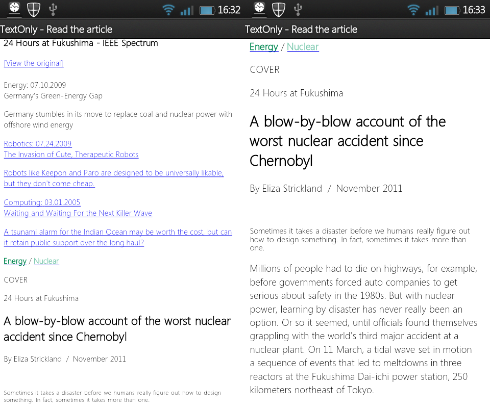 | Der TextOnly Browser ist wie der Name sagt ein Webbrowser der nur den Text der Seite anzeigt. Das spart Datenvolumen und bei vielen Seiten will man ja gerade den Text lesen. Da ist der TextOnly Browser praktisch, er verwandelt die Webseite fast in ein eBook in dem man die eigentlichen Artikel gut lesen kann. Leider ist er kein reiner Textmodus-Browser wie z.B. links auf Unixoiden Systemen sondern versucht aktiv den Artikel zu erkennen. Dadurch ist die Darstellung auf vielen Seiten auch deutlich besser weil von überflüssigem Ballast befreit, es sorg aber dafür dass er z.B. mit meinem Blog nicht funktioniert. |