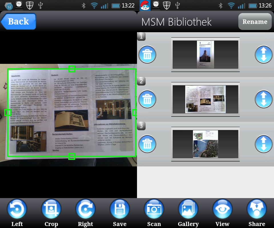 | Scan to PDF ist ein weiteres (In Folge 96 hatte ich CamScanner vorgestellt) Programm um unterwegs Dokumente mittels der Handykamera “einzuscannen” und in PDF zu wandeln. Dabei wird das Motiv wie gesagt mit der Kamera fotografiert, anschliessend kann es noch beschnitten werden, so dass nur das eigentliche Dokument zu sehen ist, und abgespeichert. Mehrere Fotos können so zu einem Dokument zusammengefügt werden. Der Text des Dokuments wird dabei im Gegensatz zu CamScanner kaum (gar nicht?) geschärft, was je nach Dokument ein Vor- oder Nachteil ist. Im Grunde fügt Scan to PDF einfach mehrere Fotos zu einem PDF zusammen (mit einigen Bearbeitungsmöglichkeiten). Ist sicher nicht immer sinnvoll, aber wenn man von unterwegs ein Dokument jemand zukommen lassen will könnte das nütlich sein. |