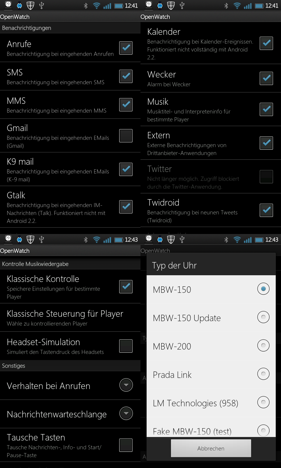 | openwatch ist ein kleines Hilfsprogramm um den Androiden an Bluetooth-Uhren wie die Sony Ericsson MBW-150 anzubinden. Diese Uhren können auf einem kleinen Display im Ziffernblatt z.B. eingehende Anrufe anzeigen, aber auch z.B. über SMS, Termine, Tweets, Chatnachriten und mehr informieren. Das Telefon bleibt stumm in der Tasche, die Uhr vibriert kurz unauffällig und zeigt an was es zu melden gibt. Der Medienplayer lässt sich zudem über die Uhr steuern (Start/Stopp und Lautstärke), was für mich vor allem beim Sport praktisch ist weil ich da Musik über das Telefon höre, selbiges aber in der Hosentasche ist wo es nicht stört. Geschrieben ist das Programm für die MBW-150 von Sony Ericsson unterstützt aber auch die anderen Uhren von Sony Ericsson (die Modellreihe ist eingestellt, es gibt aber noch Restbestände bei Amazon und ebay) sowie einige andere Bluetooth-Uhren, bevor man sich eine zulegt lohnt ein Blick in den Programmthread bei XDA-Developers. Die Anbindung via Bluetooth scheint nach einem eigenen Protokoll abzulaufen. Das Telefon führt die Uhr in den bekannten Bluetooth-Geräten mit “Pairing aktiv, aber nicht verbunden” und auch das Bluetooth-Symbol zeigt keine aktive Verbindung an. Das openwatch Symbol aber schon eine aktive Verbindung (blaues Symbol) und sie funktioniert auch. Angenehmer Effekt: bisher kann ich keine negative Auswirkung auf die Akkulaufzeit feststellen. Sie schwankt täglich genauso wie vorher und mit der aktiven Nutzung des Telefons, nicht der Uhrenverbindung. Auch die Uhr zeigt nach einer Woche Nutzung noch einen vollen Akku an. Die Bluetooth-Uhr ist eine sehr geniale Ergänzung (und openwatch das Pendant auf dem Androiden) die ich für wesentlich sinnvoller halte als den Versuch das Smartphone in die Uhr zu bauen wie Motorola es gerade wieder versucht. Leider hat Sony Ericsson die Reihe eingestellt, vielleicht hätten sie sich einen günstigeren Partner suchen sollen als Fossil, so war der Preis prohibitiv (299€ Liste). Momentan bekommt man sie schon für 40-50€ im Internetz, damit wären sie wohl weiter verbreitet. |