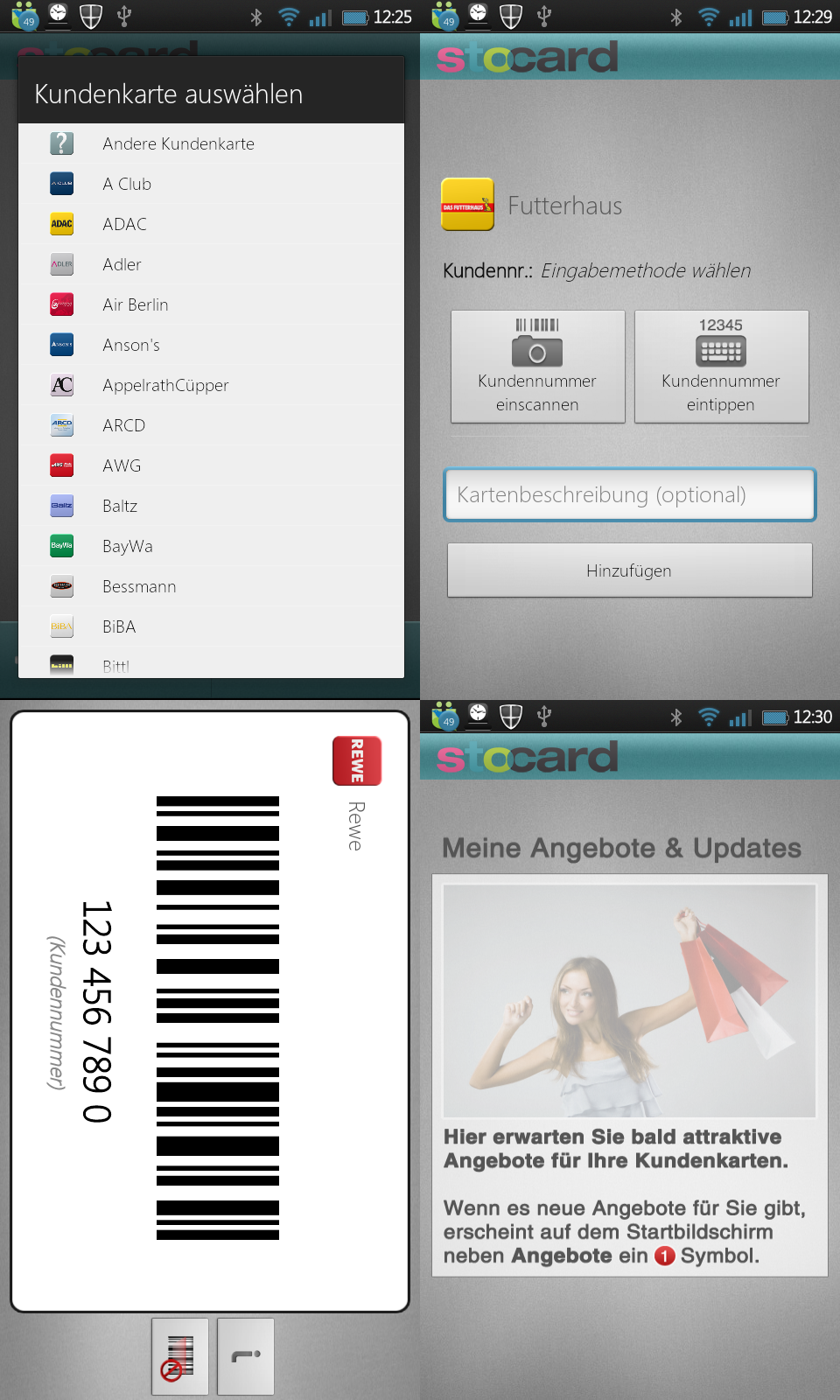 | Heutzutage hat praktisch jedes Geschäft eine eigene Kundenkarte. Sie geben Rabatt, Sammelpunkte oder lassen einen einfach wichtig aussehen wenn man sie an der Kasse vorzeigen kann. Kundenkarten haben aber den unangenehmen Nebeneffekt, dass sie sich im Portemonnaie sammeln (mal davon abgesehen dass man sich selbst zum gläsernen Kunden macht). Abhilfe schafft da stocard, das kleine Programm macht sich zu nutze dass praktisch alle Karten einen Strichcode haben der eingescannt wird. Der Strichcode stellt die Kundennummer dar und daher lässt er sich einfach generieren. So hat man alle Strichcodes virtuell im Telefon und nicht dick im Portemonnaie. Zusätzlich soll es demnächst auch Angebote der Geschäfte geben deren Kundenkarten man virtualisiert hat, das ist momentan aber nur eine Ankündigung (oder die Geschäfte deren Karten ich zum Test angelegt habe haben keine Angebote). |