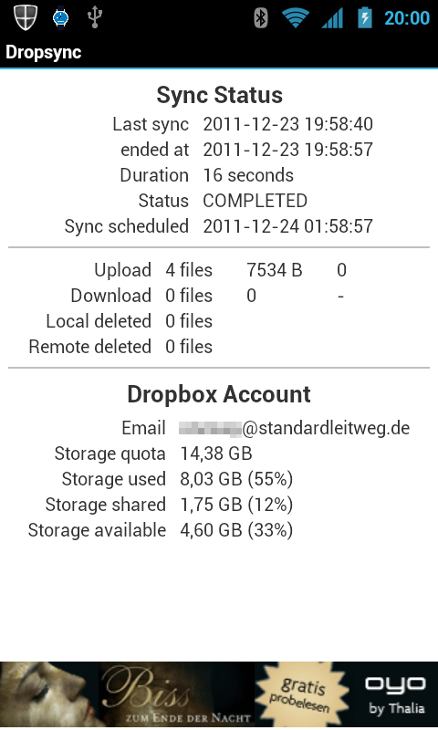 | Aufgrund persönlicher Unachtsamkeit brauchte ich vor ein paar Tagen eine neue Lösung um Dateien zwischen Android und Dropbox zu synchronisieren. Das kann der offizielle Client nämlich nicht, er gibt vollen und komfortabel Zugriff auf die in der DropBox gespeicherten Dateien, aber kann nicht automatisch auf dem Telefon geänderte Dateien zurücksynchronisieren, das muss man manuell erledigen. Gefunden habe ich Dropsync, das praktische Programm rüstet die fehlende 2-Wege Synchronisation sehr gelungen nach. Grundsätzlich verknüpft man ein Verzeichnis auf der SD-Karte mit einem Verzeichnis in der DropBox. Diese werden fortan in beide Richtungen synchronisiert. Wer diese Woche den Dropbox client noch nicht aktualisiert hat sollte lokal keinen Ordner im cache-verzeichnis /dropbox/ nehmen sondern ein neues auswählen da der neue Client das Cacheverzeichnis verschiebt und auch vor dem Medienscanner versteckt, dadurch soll es mit Android 4.0 konform werden, verschiebt aber ggf. das Verzeichnis das man synchronisieren möchte. Die Synchronisation erfolgt nun in festen Zeitabständen, wahlweise nur per WLAN und auch nur über einem bestimmten Ladestand. Die Vollversion erlaubt zudem die Synchronisation unmittelbar bei einer Änderung und die Synchronisation mehrerer Verzeichnisse oder der gesamten DropBox, die kostenlose Version synchronisiert nur ein Verzeichnis. Das aber inklusive Unterverzeichnisse, das Hauptverzeichnis der DropBox lässt sich aber nicht angeben wodurch man nicht durch die Hintertür doch die gesamte Box synchronisieren kann. Das ist meist aber auch nicht sinnvoll, ich habe mir in der Dropbox ein Verzeichnis mobilesync angelegt das ich mit einem entsprechenden Verzeichnis auf der SD-Karte synchronisiere, dort speichere ich alle Daten die ich auf jeden synchronisiert haben möchte. Alles andere hole ich mir bei Bedarf aus der DropBox. Aber so habe ich auf jeden Fall z.B. meine KeePass-Datenbank aktuell auf dem Gerät und die MindMaps die ich fast nur mobil bearbeite auch in der DropBox gesichert. Ich habe Dropsync nun knapp eine Woche im Einsatz und verschiedene Szenarien durchgespielt, sowohl Synchronisation als auch die Optionen nur per WLAN bzw. über einem bestimmten Ladestand zu synchronisieren funktionieren einwandfrei. |