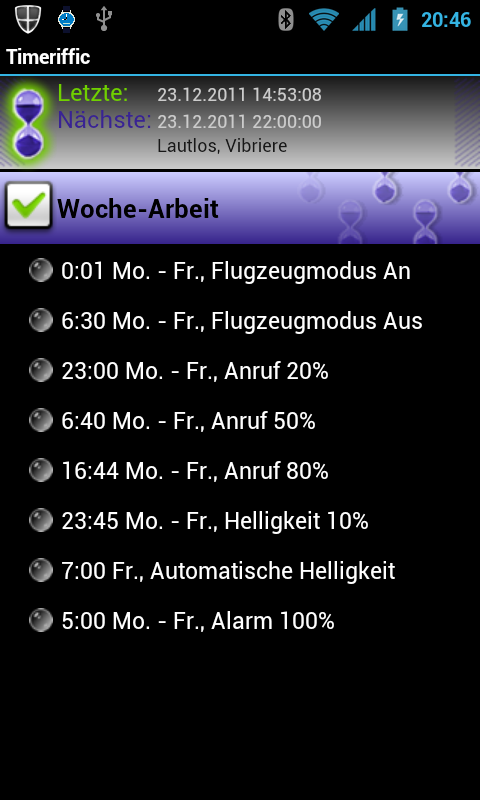 | Mit Timeriffic kann man verschiedene Optionen des Androiden je nach Uhrzeit umstellen. Z.B. stellt es sich automagisch Leise und morgens zur Arbeit automatisch halblaut und zum Feierabend auf normale Lautstärke. Steuern lässt sich so der Klingelton an sich, die verschiedenen Lautstärken (Haupt, Nachrichten, Medien, Alarm, System und Anruf), der Vibrationsalarm, der Flugmodus, das WLAN, die Helligkeit sowie Bluetooth. Hat man auch APNdroid installiert lässt sich auch noch zwischen 2G und 3G Netzwerken umschalten. Was die App tun soll organisiert man in Profilen die man einzeln ein- und ausschalten kann, zu jedem Profil kann man dann die gewünschten Aktionen mit Tag und Uhrzeit hinzufügen. So fügt man z.B. hinzu dass das Telefon Montags bis Freitags um 0:00 in den Flugmodus gehen soll, und ihn um 6:00 wieder abschalten. Die Helligkeit wird Nachts auch runtergeregelt und während der Arbeit machen wir das Telefon zwar so laut dass man es selbst hört, aber nicht stört. Den Klingelton kann man auch noch etwas dezenter einstellen. Am Wochenende bleibt das Telefon länger im Dezent-Modus um die Nachwirkungen des Abends zu berücksichtigen Ich denke Du verstehst was man machen kann. Wirklich sehr praktisch. |