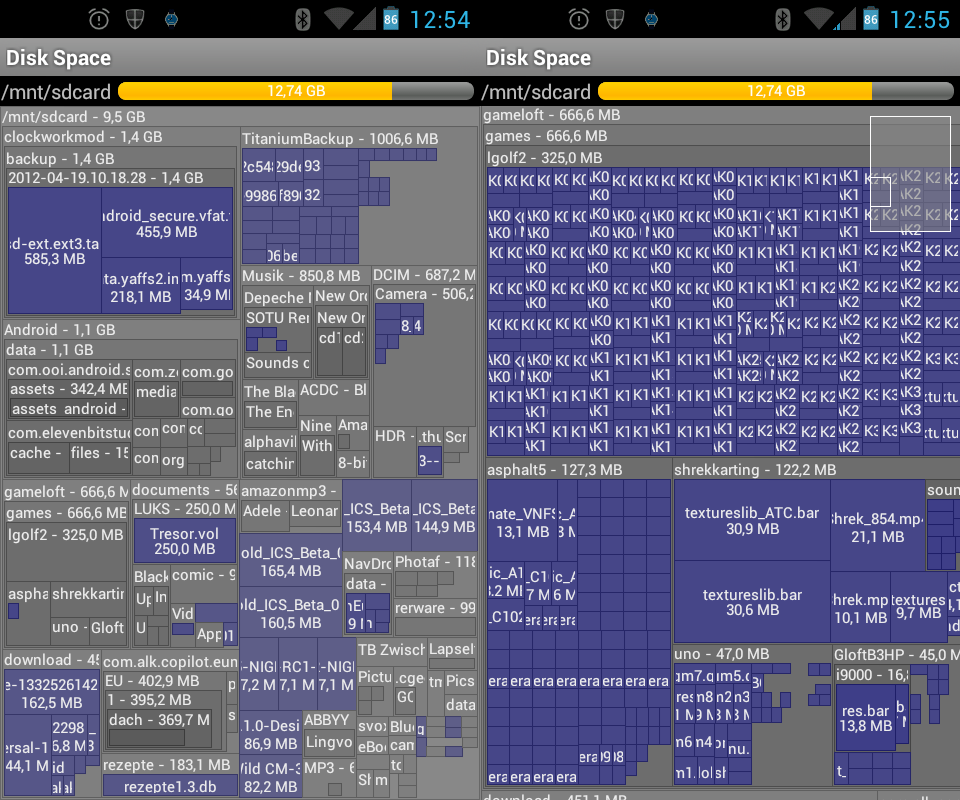 | Mit dem Speicherplatz ist es wie mit dem Geld: man hat immer zu wenig. Und ist die Karte erstmal voll geht das Suchen los wo der verdammte Platz geblieben ist. Da hilft Disk Space, es zeigt an welche Verzeichnisse und Dateien auf der SD-Karte, mit root-Rechten auch im geschützten internen Datenbereich, wie viel Speicherplatz verbrauchen. Dabei werden alle Dateien und Verzeichnisse auf der gesamten Displayfläche angezeigt, jedes flächenmässig so groß wie es ihrem Anteil am Speicherplatz entspricht. Auch wenn das auf den ersten Blick unübersichtlich wirkt erkennt man so die großen Verbraucher sofort. Und man kann die Darstellung beliebig vergrössern und so die Details bis zur kleinsten Datei ansehen. Ich finde diese Darstellung zwar nicht künstlerisch hübsch, sie sorgt aber dafür dass man in jeder Detailstufe sofort die grossen Verbraucher erkennt und auch wo, also in welchem Verzeichnis, sie sich befinden. Auf dem Smartphone ist sie mir mittlerweile deutlich lieber als eine nach Größe sortierte Liste. Testgerät: HTC Desire |