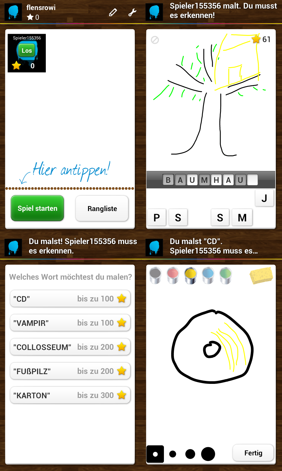 | Eine deutsche Version des Montagsmaler Spiels ist Malen mit Freunden. Es ist sehr ähnlich zu Draw Something, gefällt mir aber besser, nicht nur weil hier die Begriffe auf Deutsch sind. Auch hier meldet man sich mit einer E-Mail Adresse oder via Facebook an und findet seine Mitspieler ebenso. Eine Suche nach Spielernamen gibt es hier aber nicht. Bei Malen mit Freunden bekommt man mehr Punkte pro Begriff, allerdings “bis zu”. Denn hier kommt auch die Zeit mit ins Spiel. Ist die Zeichnung übertragen läuft die Zeit und alle paar Sekunden wird ein Buchstabe des geschten Begriffs ausgefüllt. Das kostet Punkte, denn die gibt es nur für die selbst erratenen Buchstaben des Wortes. Testgerät: HTC Desire |