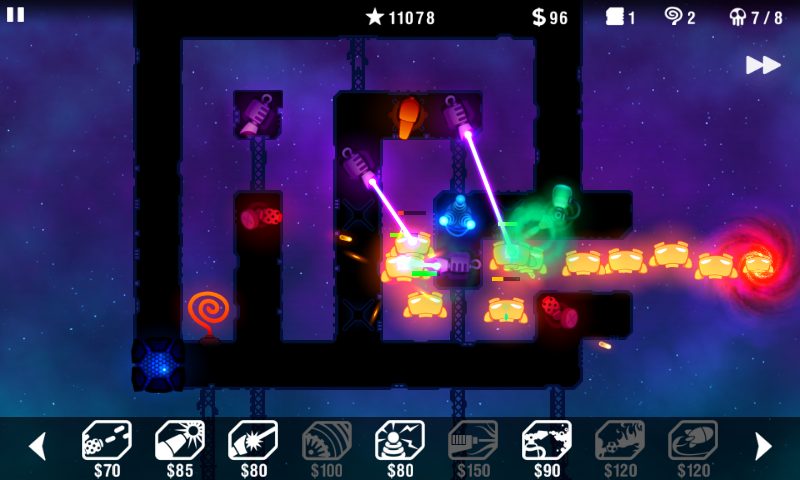| Radiant Defense ist ein Tower-Defense Spiel von und im typischen Stil der Spieleschmiede Hexage (Radiant, Robotek, EVAC, Everlands). Der Grafik- und Soundstil ist somit schonmal eigen und Hexage hat das klassische Spielprinzip um ein, zwei Punkte variiert. Die Verteidigungstürme baut man nicht einfach so auf einem Spielfeld sondern auf bestimmte Plattformen im Weltall. Die sind teils vorgegeben, lassen sich aber um eigene Plattformen erweitern, man muss dann halt zwei Dinge bauen. Das Bauen erfolgt hier rundenbasiert, die Hintergrundgeschichte ist so angelegt daß die Verteidiger das Angriffstor unter Kontrolle haben. Die angreifenden Aliens kommen auch hier in Wellen, welchen Weg sie nehmen werden sieht man während der Bauphase ständig anhand sich bewegender Totenköpfe, so kann man direkt sehen wie sich neue Plattformen auswirken und wo man die Kanonen platzieren sollte. Das ähnelt der Routenplanung in Anomaly Warzone Earth. Der Umfang an Dingen die man bauen kann ist hier sehr groß, neben sehr vielen verschiedenen Angriffstürmen gibt es eine Forschungseinrichtung die die Anzahl noch einmal erweitert und diverse weitere Gebäude die keine Offensivwaffen darstellen sondern den Gegner “beleuchten” so daß er besser getroffen werden kann, eine Recyclingeinheit die das Geld das man für einen Abschuss bekommt verdoppelt, “Angstgeneratoren” und mehr. Es lohnt sich die Beschreibungen zu lesen. Erklärt wird das Spiel in einem guten Tutorial das einem Stück für Stück mit den Eigenarten vertraut macht. Eine schöne Bereicherung des Tower Defense Genres, hier der offizielle Spieltrailer, verdammt Bunt das Spiel :-D: Testgerät: HTC Desire |