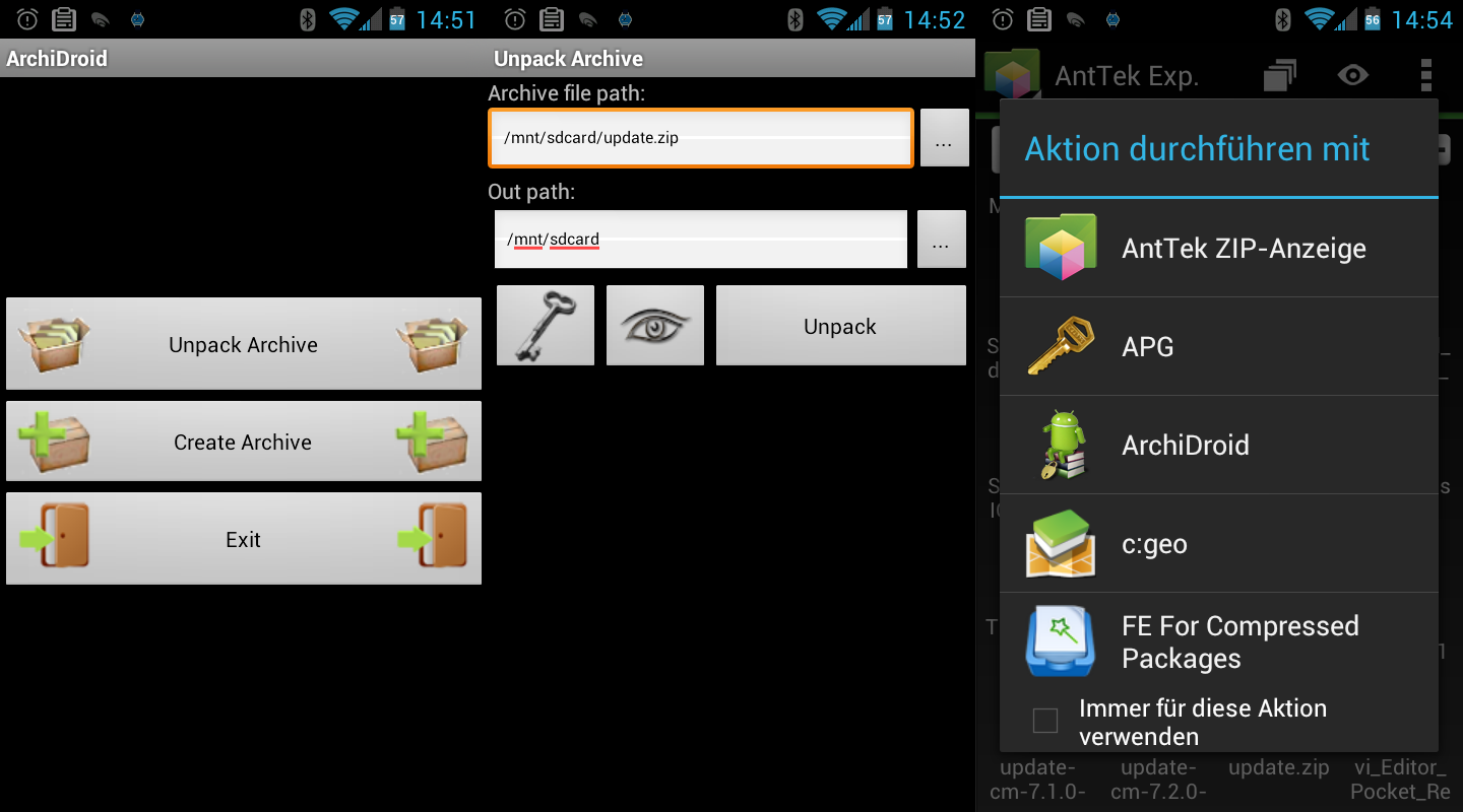 | ArchiDroid ist ein Archivmanager. Er unterstützt mit den Formaten RAR, ZIP, TAR, GZIP (gz), BZIP2 (bz2), tar.bz2, tar.gz und 7ZIP (7z) praktisch alle relevanten Formate. Die Oberfläche ist simpel, man wählt das Archiv aus das ausgepackt werden soll und wohin. Vor dem auspacken kann man sich auch noch den Inhalt ansehen. Meist wird man ArchiDroid zum entpacken aber über die Teilen-Funktion aus einem anderen Programm heraus ansprechen, dann muss man das Archiv selbst nicht mehr heraussuchen sondern nur noch auswählen wohin es entpackt werden soll. Will man ein Archiv erstellen wählt man ebenso erstmal Namen und Zielort aus und fügt anschliessend die Dateien hinzu. Für diese Funktion fügt sich ArchiDroid leider nicht in die Teilen-Funktion ein, die Dateien muss man direkt in ArchiDroid auswählen. Wer keinen Dateimanager nutzt der von sich aus mit Archiven umgehen kann sollte sich ArchiDroid mal ansehen, das gilt aber genauso wenn es ein seltenes Format ist, z.B. 7zip wird nur von wenigen Programmen unterstützt. Testgerät: HTC Desire |