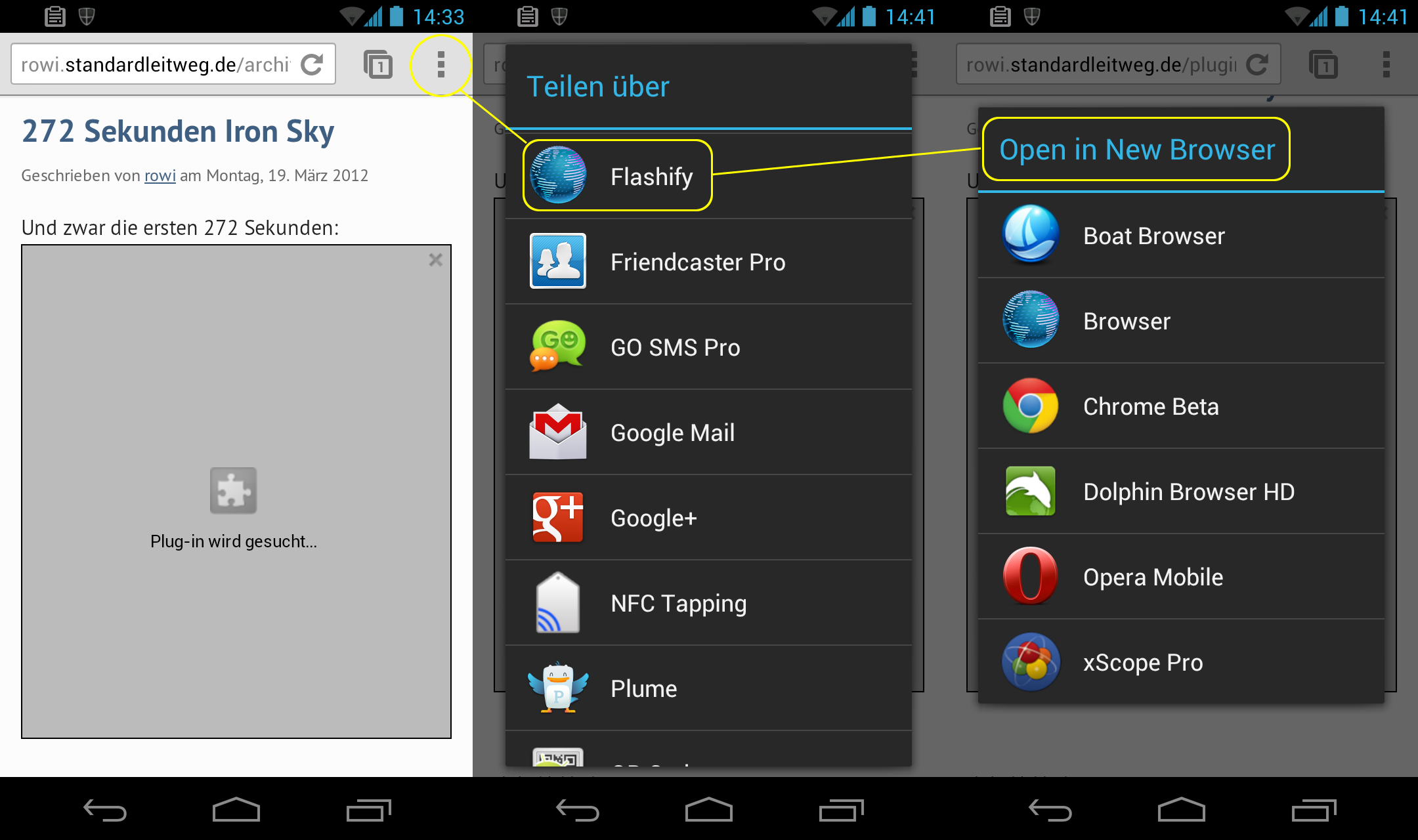 | Google hat mittlerweile den “großen” Browser Chrome auf Android portiert, der funktioniert auch ganz gut, unterstützt aber nicht das Flash-Plugin (oder das Plugin unterstützt Chrome nicht) und allen Beteuerungen zum Trotz das Flash Tot ist ist das leider praktisch noch nicht der Fall. Man braucht es ab und zu und dann ist es doof daß das in Chrome nicht läuft. Flashify kann auch nicht zaubern, es fügt sich einfach als Ziel für die “Teilen” Funktion ein und bietet dann alle Browser an. Denn der normale Browser wird nicht angeboten wenn man den URL teilen will (xScope allerdings schon). So kann man zumindest über die Teilen-Funktion eine Seite mit Flash an einen Browser übergeben der Flash unterstützt. Testgerät: Samsung Galaxy Nexus |