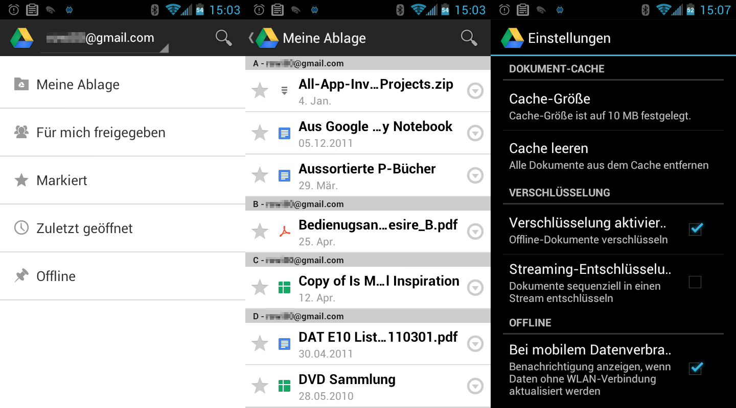 | Letzte Woche hat Google mit Drive eine eigene Online-Festplatte vorgestellt. Clients gibt es für Windows, MacOS (leider noch nicht für Linux) und mobil für Android und Apple. Die Android Version ist praktisch gesehen ist Google Drive das bekannte Google Docs das nur etwas erweitert wurde. Es lassen sich nun alle Dateitypen speichern, das war es schon fast Die Dateien aus der Onlinefestplatte werden auf dem Gerät zwischengespeichert, standardmässig sind es 10MB, maximal kann man 30MB einstellen. Sehr schön ist, daß diese Dateien optional auch verschlüsselt gespeichert werden, so daß sie nicht von der Speicherkarte einfach ausglesen werden können. Sobald man ein von Google Docs unterstützes Dokument anwählt öffnet sich auch wie gewohnt z.B. die Textverarbeitung, Google Drive ist wirklich nur Google Docs das dahingehend erweitert wurde daß nicht zum bearbeiten unterstützte Dateitypen halt gespeichert werden können. Es bietet sich nun auch als Ziel für die Teilen-Funktion an so daß man von überall her Dateien und Dokumente in Google Drive speichern kann. Wer Google Docs installiert hatte hat mit einem Update nun Google Drive auf dem Gerät, es wurde nur umbenannt. Die Office-Funktionen von Google Docs hatte ich in Folge 77 beschrieben. Testgerät: HTC Desire |