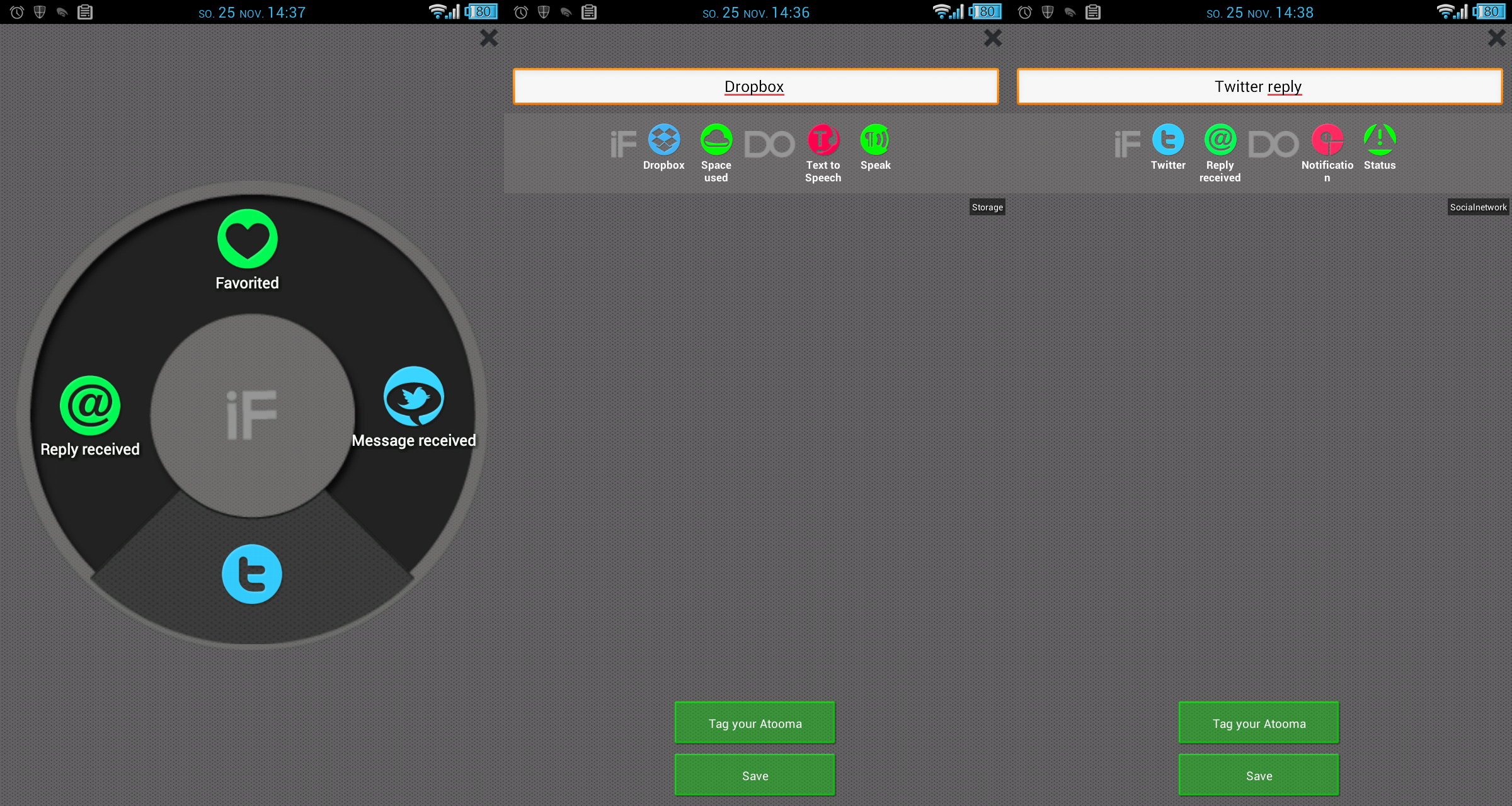 | So ein Smartphone ist ja ein ein verkleinerter Computer der auch telefonieren kann, aber halt auch wie ein großer Computer Dinge automatisch erledigen. Und soetwas kann man mit Atooma einfach konfigurieren. Ein Atooma ist ein einfaches Rezept nach dem Prinzip wenn-Dies-dann-Das. Aus verschiedenen Auslösern (“If”) kann man festlegen was passieren muss damit das ausgeführt wird (“do”) was man anschliessend festlegen kann. Die Auslösern können Dinge sein wie ein niedriger Akkustand oder ein bestimmtes WLAN, oder auch z.B. eine Nachricht bei Facebook oder Twitter. Anschliessend legt man fest was dann passieren soll, ich habe es testweise mal so eingestellt dass das Telefon zu mir spricht wenn der freie Speicher in meiner Dropbox zu klein wird und mir ein Hinweis in der Statuszeile angezeigt wird wenn mir bei Twitter jemand etwas schreibt. Würde man wohl eigentlich eher andersrum machen, zum ausprobieren war das aber OK Solche Automatisierungslösungen gibt es verschiedene, neben dem Funktionsumfang ist vor allem die Bedienung ein Unterscheidungskriterium, während das in Folge 36 vorgestellte Tasker eher auf den Funktionsumfang setzt aber eher schwer zu konfigurieren ist setzt Atooma auf einen ganz guten Funktionsumfang mit einfach aufgebauter Konfiguration. Wäre es auf deutsch könnte man es bedenkenlos empfehlen, so muss man je nach Sprachkenntnis etwas experimentieren was durch das intuitive Interface aber auch nicht schwer fällt. Und es ist offiziell auch noch eine Beta-Version, da kann eine Lokalisierung ja noch kommen. Testgerät: Samsung Galaxy Note |
