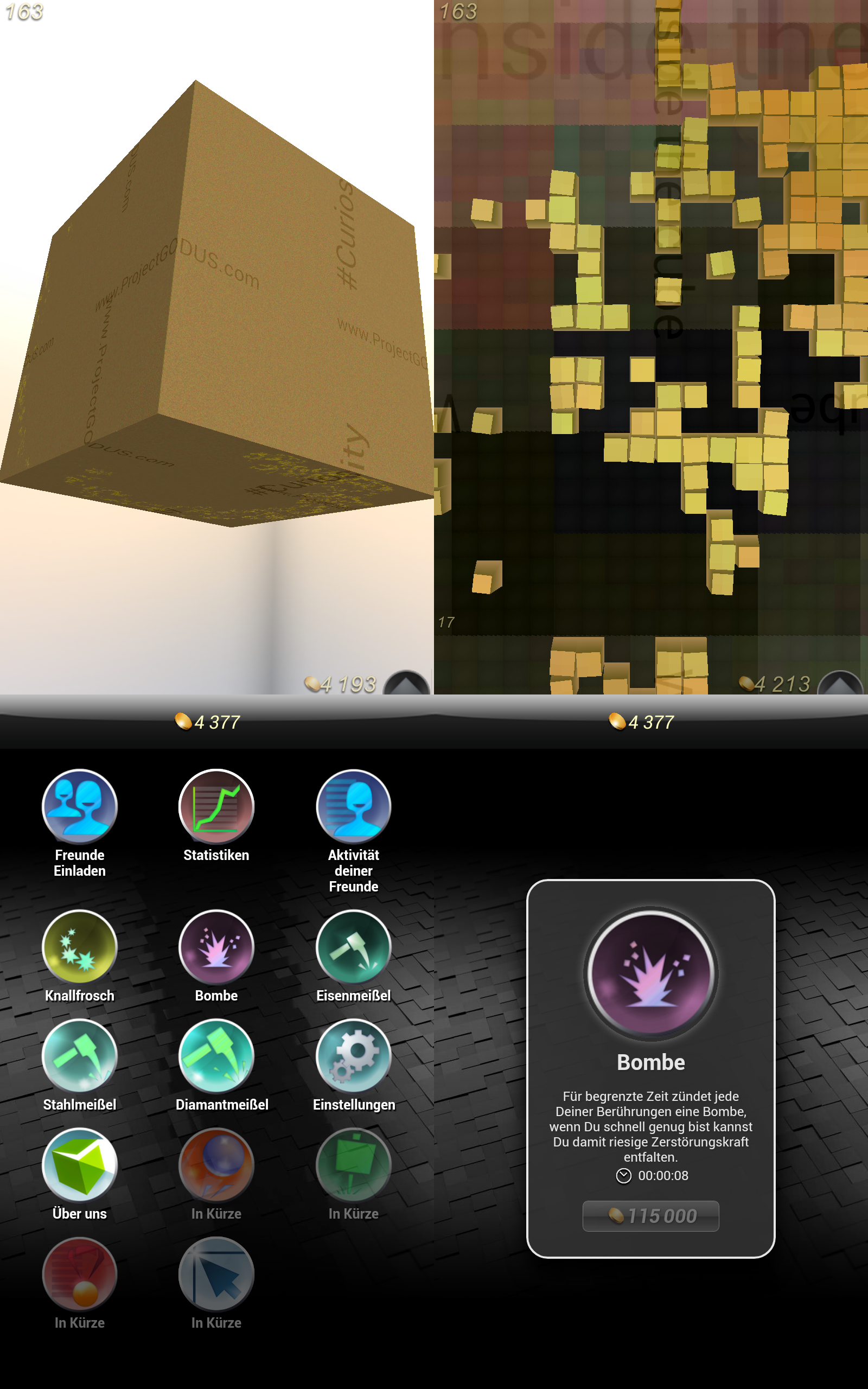 | Curiosity ist anders. Das Spiel des bekannten Spieleentwicklers Peter Molyneux von dem legendäre Titel wie Populous und Dungeon Keeper stammen hat hier ein Spiel geschaffen in dem es eigentlich nicht viel zu tun gibt. Und doch tut man es. Curiosity ist ein großer Würfel der aus vielen kleinen Würfeln zusammengesetzt ist. Deine Aufgabe ist es, diese kleinen Würfel nacheinander Schicht für Schicht abzutragen um zu sehen was sich in seinem inneren befindet. Jede Schicht ist etwas anders aufgebaut und für jeden abgetragenen Kleinwürfel gibt es Punkte die zu mehr Möglichkeiten und Werkzeugen führen. Ach ja, Du meisselst auch nicht allein: Alle Spieler von Curiosity tragen den gleichen Würfel ab. Und nur einer wird als erstes sehen was sich im inneren befindet. Also je mehr Würfel du abträgst, desto mehr Werkzeug um effektiver abtragen zu können kannst Du bekommen und dir einen Vorteil verschaffe. Die anderen Tausende Mitspieler versuchen das Gleiche. Ein wirklich merkwürdiges Spiel, man tut nicht wirklich etwas ausser auf Würfeln herumzutippen, aber man kann auch nicht aufhören. Curiosity ist Luftpolsterfolie für Smartphones Hier noch der Trailer: Testgerät: Samsung Galaxy Note |