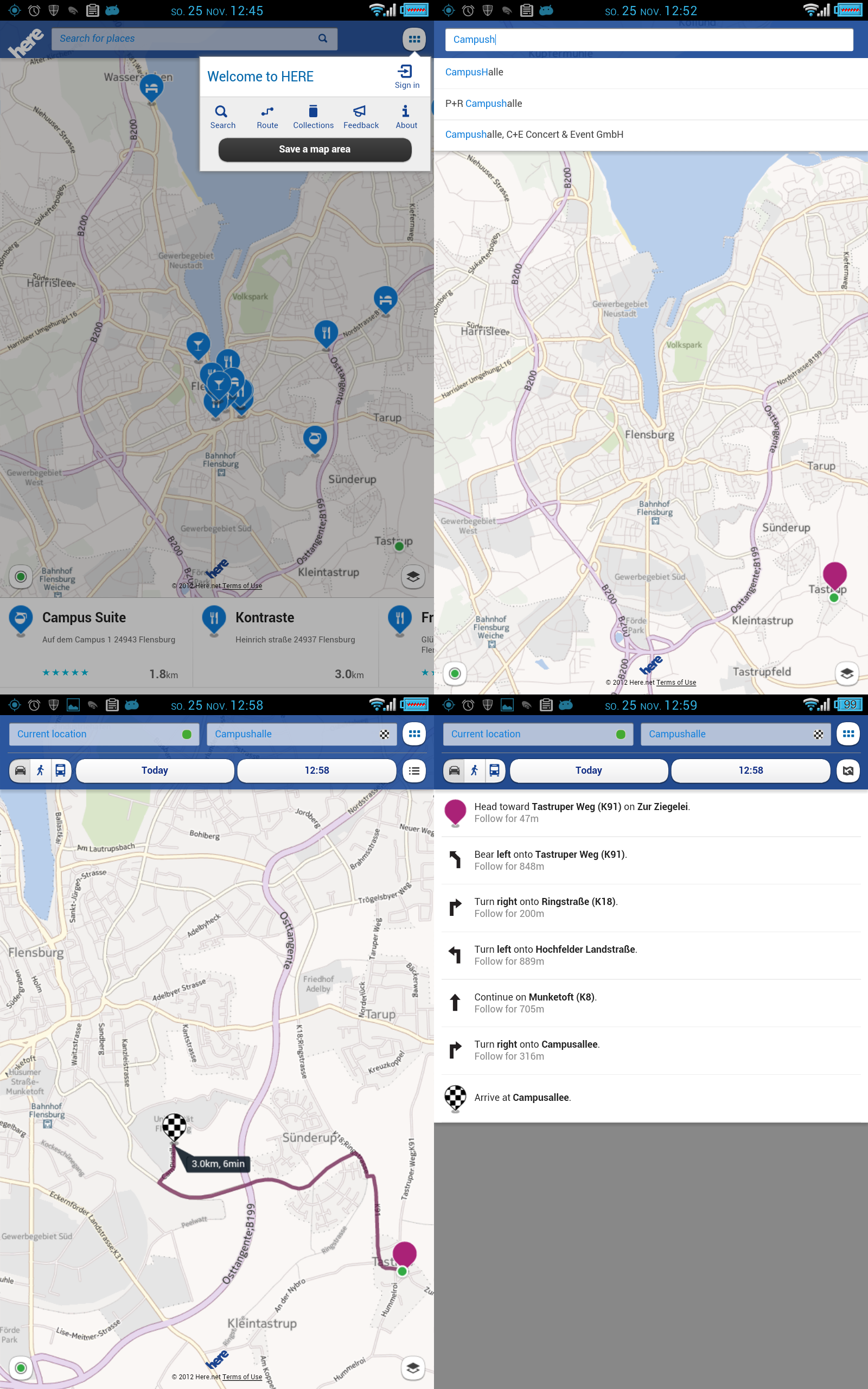 | HERE Maps ist die neue Kartenanwendung von Nokia. Nokia hatte Navteq gekauft, das ist einer von zwei großen Anbietern von Kartenmaterila das in Navis usw. steckt. Und nach meiner Erfahrung sind es bessere Karten als die von TeleAtlas die mitllerweile zu TomTom gehören. Dies ist nun also die Kartenanwendung von Nokia, die ja eigentlich auf Windows Phone setzen, für Android. Man bekommt sie nicht im Play Store sondern zumindest momentan ausschliesslich im Amazon App Shop. Warum auch immer. Der Link hinter dem Amazon-Logo leitet dich auf die amerikanische Amazon-Seite mit der App, in Deutschland hat Amazon zwar den Shop gestartet, aber den Webshop noch nicht. Auf der amerikanischen sehe ich aber auch alle meine Androiden und kann ihnen Apps zuschicken. Das Icon unten links zentriert die Karte auf den aktuellen Standort, das funktioniert aber ausschliesslich über GPS und nicht über die stromsparende Netzwerklokalisierung. Das heisst, hier im Innenraum nutzt es schon die Netzwerklokalisierung, aber nur nachdem ich das GPS aktiviert hatte. HERE Maps fragt das System offenbar gar nicht erst nach dem Standort wenn GPS nicht aktiv ist. Hat es erstmal einen Standort ermittelt blendet es unten direkt Restaurants in der Nähe ein. Das ist praktisch wenn man gerade etwas zu essen sucht, lässt sich aber auch nicht konfigurieren. Die eigentlichen Funktionen von HERE Maps sind hinter dem Punkte-Knopf oben rechts verborgen, hier kann man suchen (die Suchleiste ist aber auch immer oben im Bildschirm eingeblendet), die Navigationsfunktion aufrufen und die “Collections” ansehen, das sind offenbar Orte die man als Favoriten markiert hat. Die Funktion funktioniert nur wenn man sich mit einem Nokia-Account anmeldet und um die Seite zu verlassen muss man in diesem Fall die Zurück-Taste benutzen. Nokia weiss also schon dass es die gibt. Die Navigation ist einfach, man wählt das Ziel aus (Start ist standardmässig der aktuelle Standort, kann aber auch geändert werden), hier gibt man entweder die Adresse ein oder auch direkt einen Ort, ich habe einfach mal die Flens-Arena gesucht weil ich dort nachher hin soll, sie ist noch unter dem bis letzte Woche korrekten Namen “Campushalle” verzeichnet. Antippen, aufs Auto wechseln und die Route wird angezeigt. per Icon wechselt man zur Navigationsliste. Eine gesprochene Ansage scheint es noch nicht zu geben. Das war es auch schon an Funktionen, ehrlich gesagt halte ich die App in der derzeitigen Version für überflüssig. Auch weil die Karten einzeln als Grafiken in Kacheln heruntergeladen werden und nicht als Vektorinformation. Dadurch wird bei jedem ändern des Zoom-levels nachgeladen. Einziger Pluspunkt sind die Navteq-Karten, aber grobe Fehler hatte ich in denen von Google auch noch nicht so daß das eigentlich auch kein Grund ist. Du kannst es ja vielleicht auch mal ausprobieren und unten Deine Meinung dazu schreiben. Testgerät: Samsung Galaxy Note |