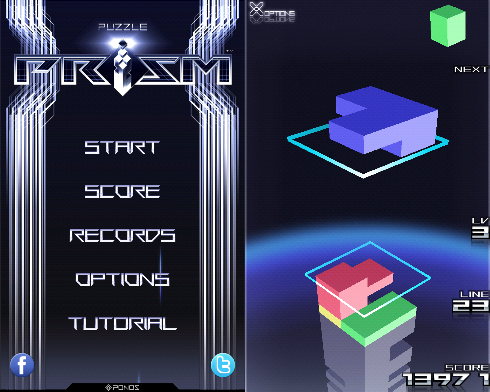 | Puzzle Prism ist eine 3D Tetris-Variante. Das Spielfeld hat eine Grundfläche von 2×2 Feldern, ist also relativ klein und die Anzahl der verschiedenen Blöcke auch begrenzt. Zumindest auf den ersten Blick, hier sind sie aber teilweise auch Dreidimensional und passen dadurch vielleicht oberflächlich gesehen aber ein Klotz unten drunter sorgt dafür dass der Klotz als ganzes doch nicht so perfekt passt. Es ist nicht so einfach wie es vielleicht aussieht. Der quadratische Turm und der zu legende Klotz drehen sich langsam um die eigene Achse so dass man ihn von allen Seiten betrachten kann. Den zu legenden Klotz kann man nur mit Wischbewegungen nach links und rechts drehen, also z.B. nicht umdrehen, und mit einem Wisch nach unten ablegen. Vollständige Ebenen verschwinden auch hier. Ein ganz simples Spiel das aber süchtig macht. Hier mal das Spiel im Video: Testgerät: Samsung Galaxy Note |