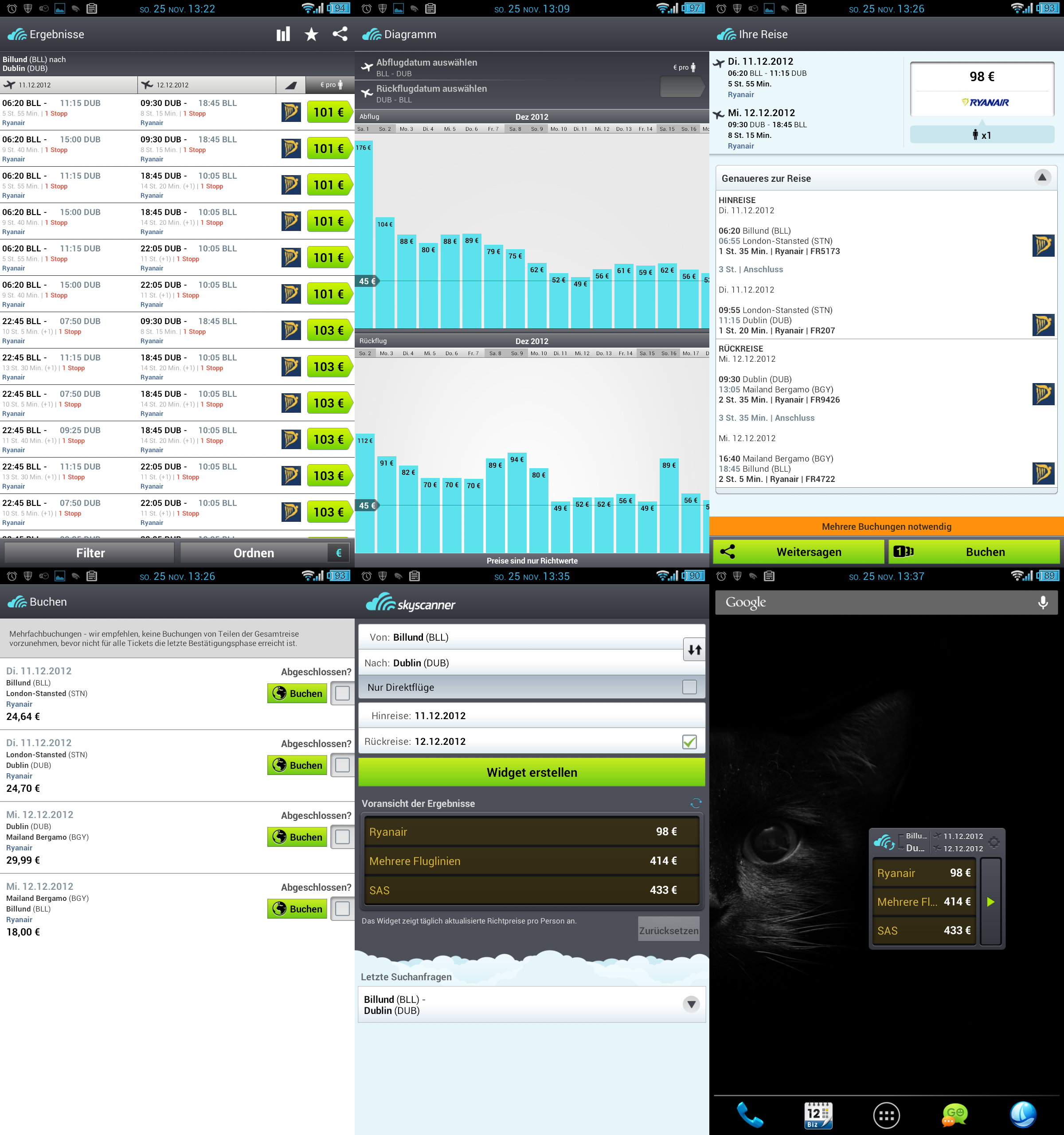 | Skyscanner ist eine Flugsuchmaschine mit der man den günstigsten Flug finden soll. Bei mir liegt gerade keine konkrete Reise an, aber ich habe mal etwas rumgespielt. Als Ziel Dublin eingestellt, als Abflugflughafen werden die nächstgelegenen um den eigenen Standort vorgeschlagen, man kann aber auch beliebige eingeben. Gibt man kein konkretes Datum ein werden einem dann auf einem Zeitstrahl die ungefähren Preise für Hin- und Rückflug angezeigt. Diese Ansicht kann man scrollen und so beliebig weit in die Zukunft blicken. Und siehe da, in der Woche kostet mich der Flug von Billund oder Hamburg nach Dublin weniger als eine Zugfahrt von Flensburg nach Hannover. Äpfel mit Birnen verglichen, aber dass ich für etwa 50€ nach Dublin komme war mir nicht bewusst. Wählt man ein konkretes Datum für den oder die Flüge aus werden konkret die verfügbaren Flüge inkl. der relevanten Nebenbedingungen angezeigt. Auch hier kann man wieder auf den Zeitstrahl wechseln. Über Filter lassen sich weitere Kriterien festlegen wie die Uhrzeiten, anzahl der Zwischenstopps und die Fluggesellschaften. Wenn ich für meine Verbindung hier Ryanair abwähle vervierfacht sich der Preis Tippt man einen Flug an kann man sich erstmal die genauen Details ansehen. Hier sieht man auch wo Skyscanner den Flug gefunden hat, bei mir war es Expedia. Im Falle der Ryanair Verbindung muss ich die Abschnitte einzeln buchen, dazu leitet Skyscanner auf die Webseite der Fluggesellschaft. Da das auf dem Telefon je nach Webseite etwas anstrengend sein kann dort zu buchen kann man im Skyscanner auswählen dass nur Gesellschaften mit mobiler Webseite berücksichtigt werden sollen, es steht aber auch in den Suchergebnissen dabei. Für Strecken die man regelmässig fliegt kann man sich auch ein Widget anlegen das die gerade besten Anbieter anzeigt. Skyscanner sieht für mich wirklich gut aus, das Weiterleiten auf die Webseite der Fluggesellschaft mag etwas komisch wirken und bei schlechten Webseiten auch eher anstrengend, mir gefällt es aber denn es ist direkter und ohne Kommunikation zwischen Anbietern was ja oft dazu führt dass sich der Preis doch noch gewaltig ändert. Das war zumindest bei meinem Versuch gerade nicht der Fall, zumindest bis es ans bezahlen ging. Testgerät: Samsung Galaxy Note |