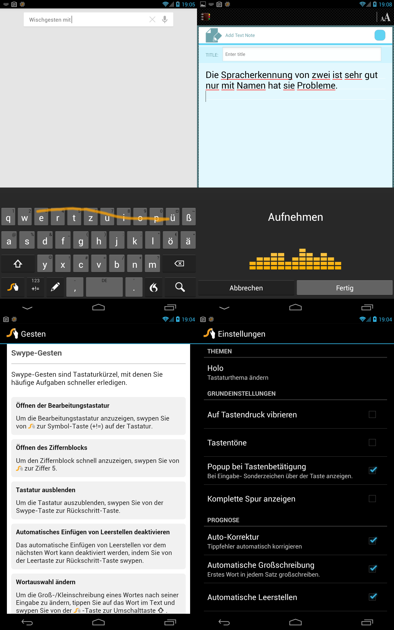 So wirklich habe ich mich zwar noch nicht daran gewöhnt mit meinem Telefon zu sprechen, aber die Wischeingabe von Swype funktioniert wirklich wunderbar und wenn man normal tippt erkennt und korrigiert die Tastatur Tippfehler anhand eines Wörterbuchabgleichs und bietet ausserdem eine Wortvorhersage ähnlich wie Swiftkey (Vorgestellt in Folge 26 und Folge 81) welches wiederum in der aktuellen Version auch die Eingabe mit Wischgeste beherrscht.