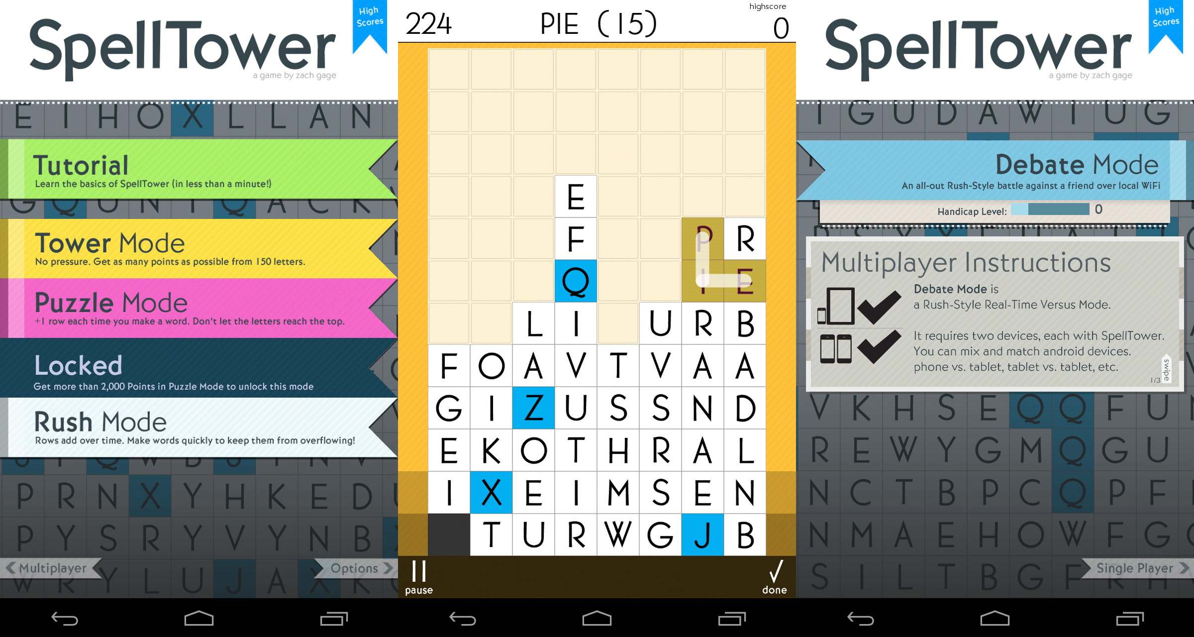 Spelltower ist ein wirklich kniffliges Spiel, leider ist es aber komplett englisch. Das ist für viele auf den ersten Blick kein Problem, aber da man ja sehr genau gucken muss was für ein Wort man auswählt kommt man schnell an die Grenzen seines Wortschatzes. Ein native Speaker hat da deutlich Vorteile.