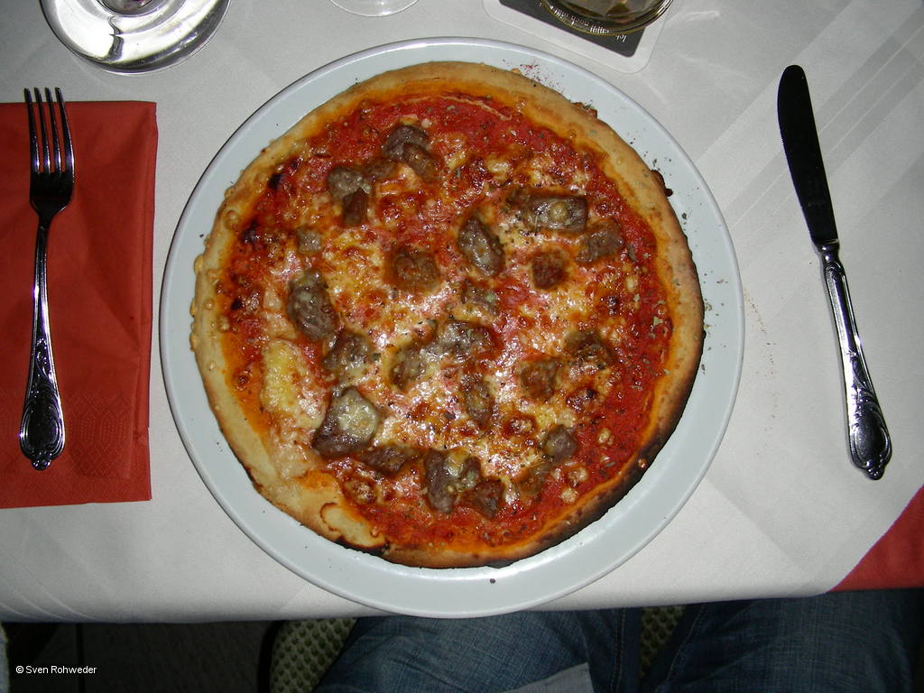 Nach dem Beschluss den Einkauf auf den Sonntag zu verschieben (Transportmöglichkeit!) sind wir gemeinsam in die Angelburger Strasse ins Casa Giuliano getrabt und haben dort noch ein paar Stunden bei gutem Essen (eine fabulös gute Pizza mit hauchdünnem Boden und Fleischspitzen drauf, njam!) und weingeistiger Unterhaltung verbracht.
