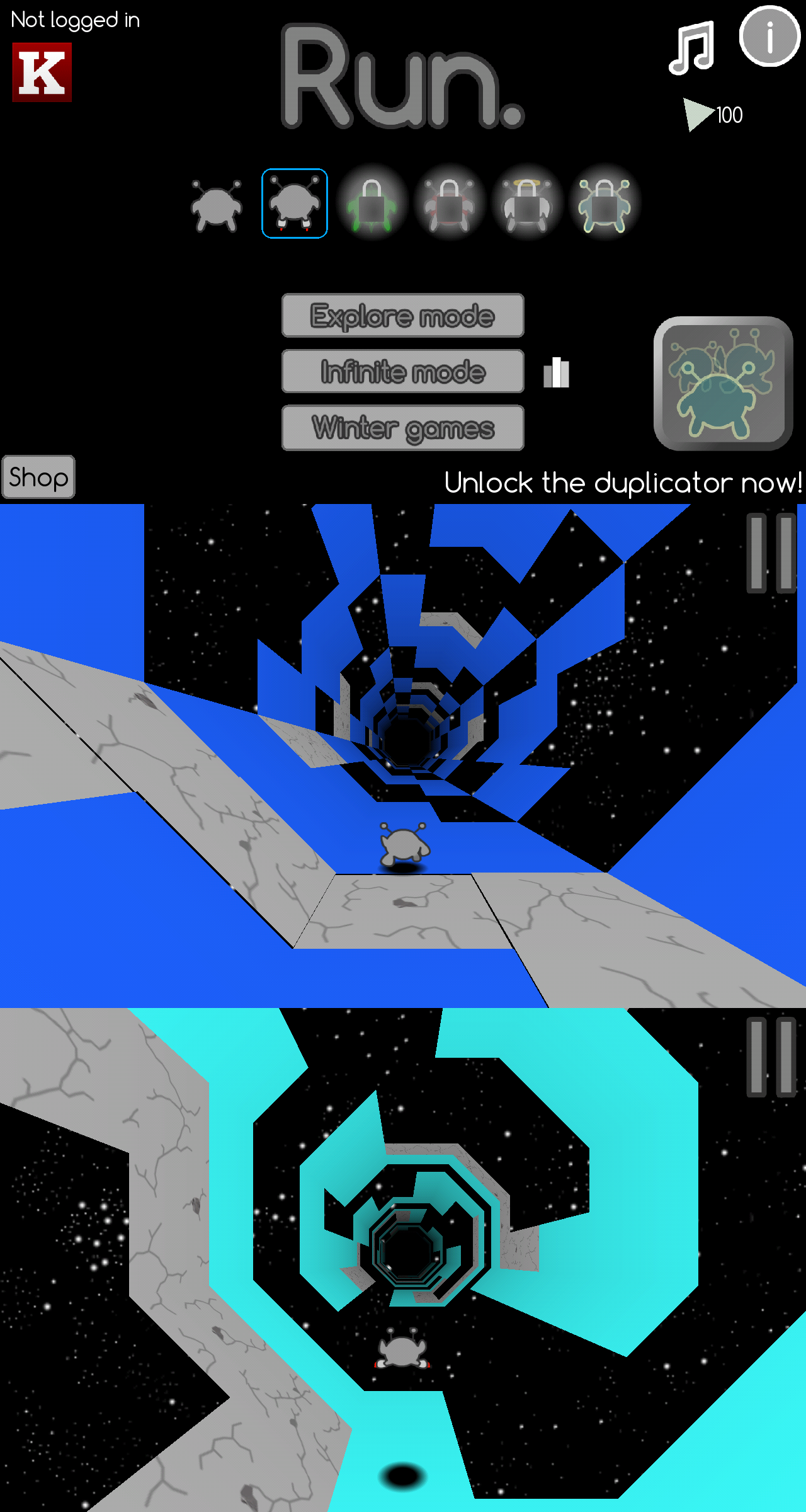 Run ist so ein Spiel das dem Thema eine interessante Eigenschaft hinzufügt. Es ist dabei absolut einfach in der Grafik gehalten und auch die Änderung ist simpel aber mit grosser Wirkung: die Steuerungsmöglichkeiten sind sogar etwas reduziert, man muss springen oder/und sich seitwärts bewegen, ducken gibt es nicht. Dafür ist die Seitwärtsbewegung stufenlos und nicht wie üblich in drei festen Bahnen. Und das Spielfeld ist dreidimensional. Die ersten Meter kann man noch problemlos mit springen und etwas seitwärts verschieben überbrücken, aber dann kommt man zwangsläufig an eine Stelle über die man nicht mehr springen kann. Also bewegt man sich am Rand einfach weiter seitwärts und die Röhre (rund oder eckig je nach Level) dreht sich mit. Zudem gibt es Felder die brechen wenn man darüber läuft. Eigentlich kein Problem, man ist ja schon drüberweg und es geht immer nur vorwärts. Allerdings brechen alle zusammenhängenden Felder, also evtl. auch Bereiche die noch vor einem liegen.