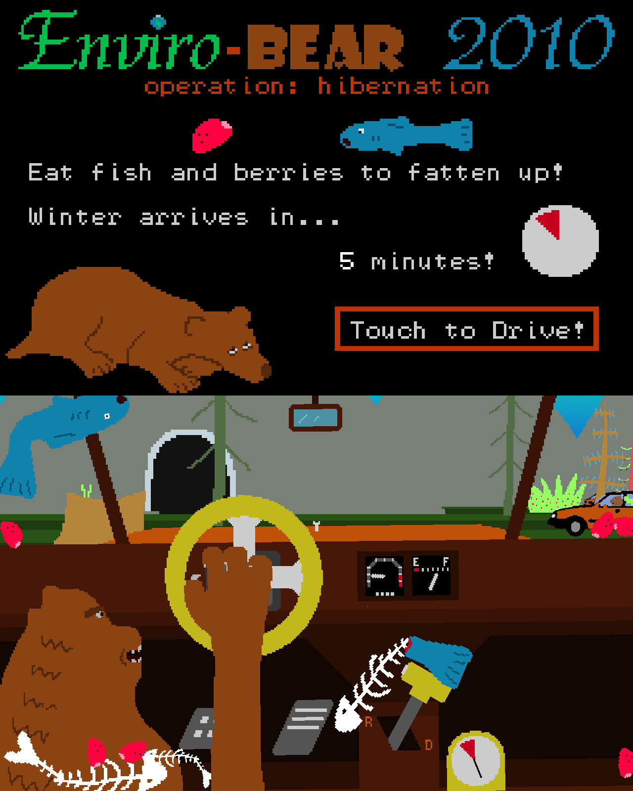 Man steuert einen Bären der sich für den nahenden Winter fettfrissen soll/muss/will. Was liegt näher, als das in eine Auto zu tun?