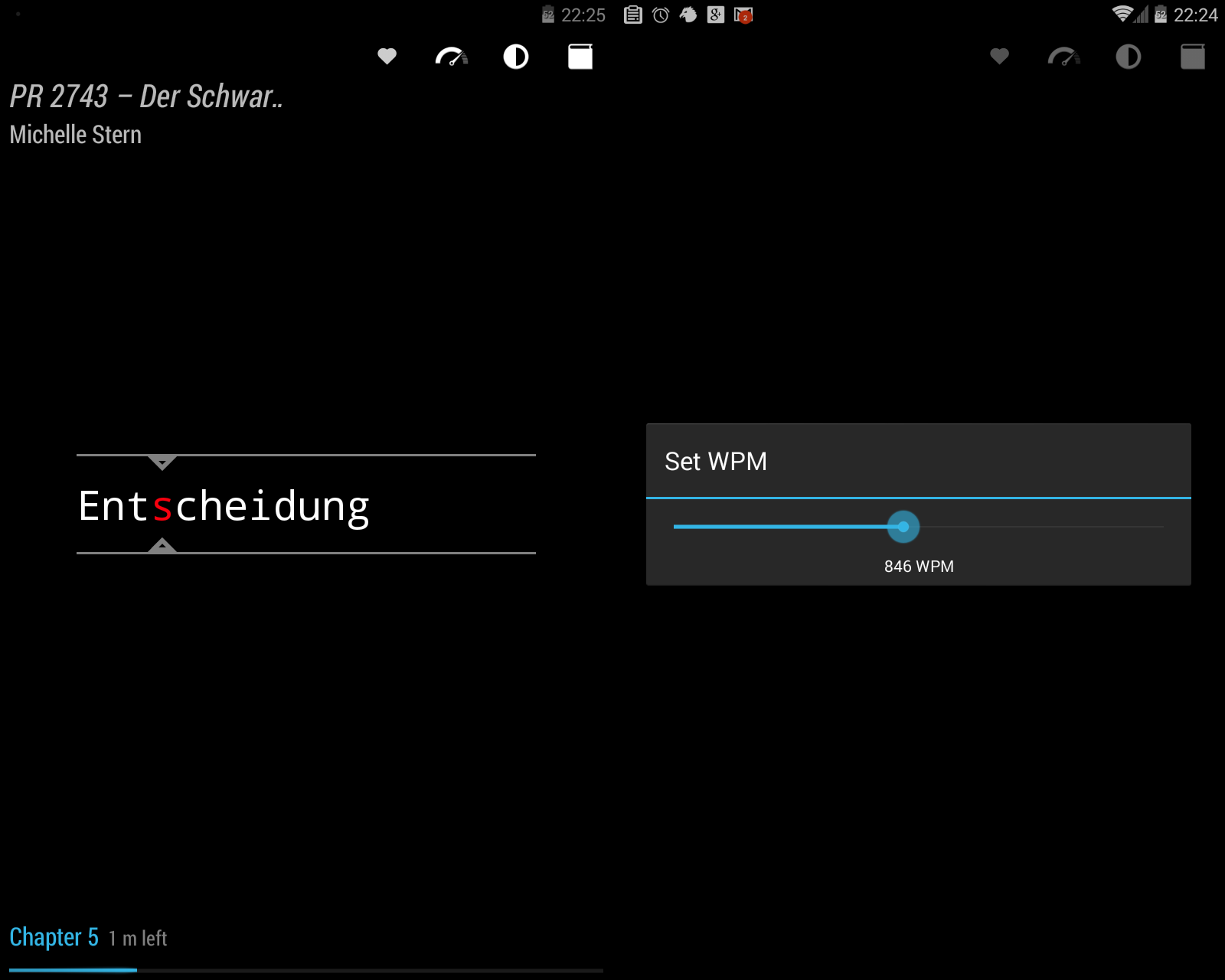 Der Glance Reader implementiert genau diese Technik für Android. Mit ihm lassen sich eBooks im ePub Format nach genau diesem Prinzip lesen. Momentan ist es mehr auf dem Stand einer technischen Demo, man liest wirklich von Anfang an mit allem was an Copyright usw. auf den ersten Seiten so steht. Damit kann man sich aber auch daran gewöhnen. Den eigentlichen Text des Buches kann man dann erstuanlicherweise problemlos mit ~800 Wörtern pro Minute lesen (über 12 pro Sekunde!), bis zu 1000 sollen möglich sein. Das schaffe ich aebr wohl nur nach einiger Übung