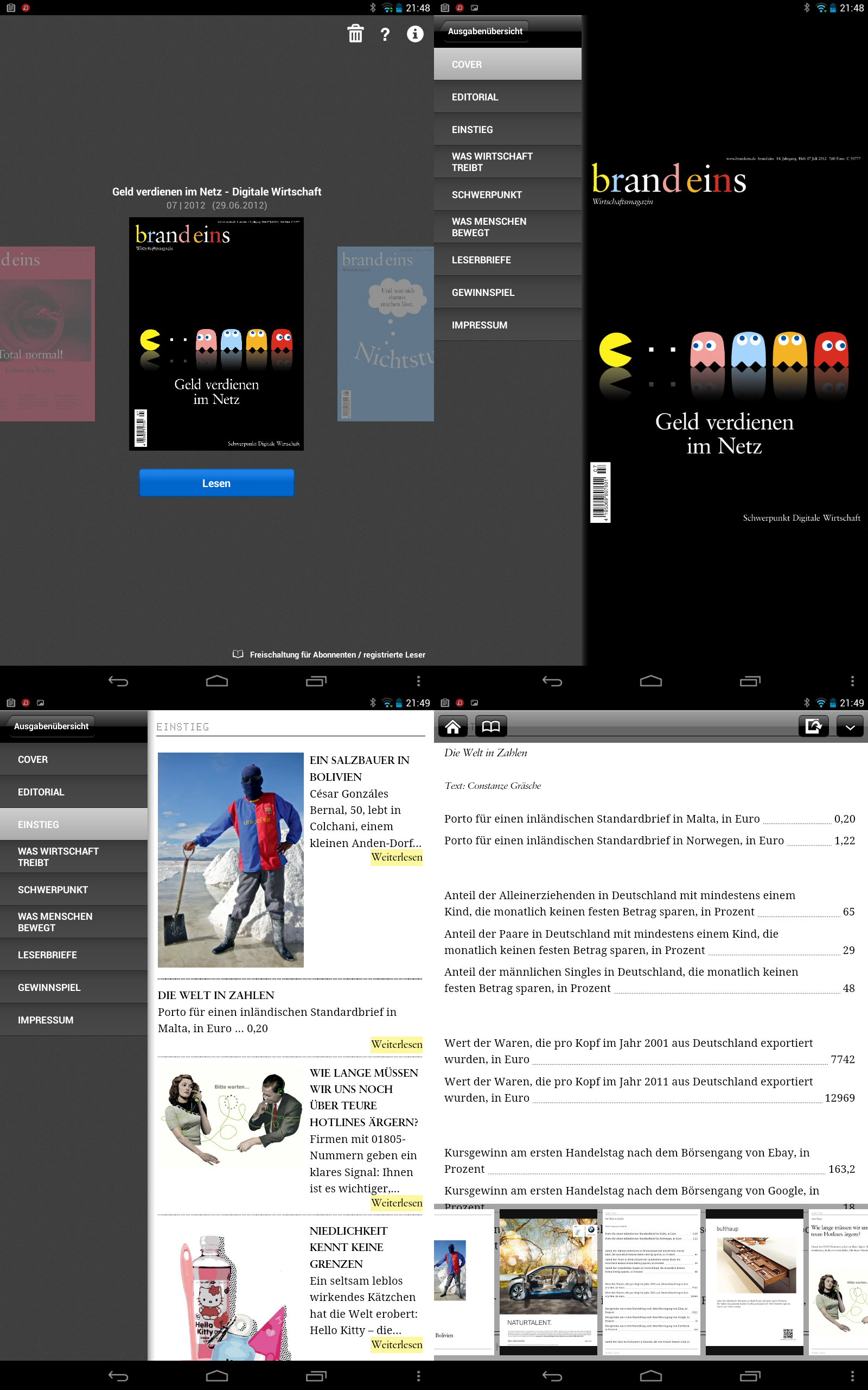 Die Android App der brand eins bringt die Zeitschrift sehr gelungen auf Tablets und Smartphones. Der Inhalt ist geteilt in die Hauptbereiche in der linken Spalte und rechts sind die Artikel der Bereichs. Tippt man auf das “weiterlesen” (es funktioniert nur direkt das Wort) gelangt man zum Artikel. Diese sind richtig als Text in der App und nicht einfach nur eingescannte Seiten. Sehr gut lesbar, Abends würde ich mir aber ein Schwarz auf Sepia Modus wünschen.
