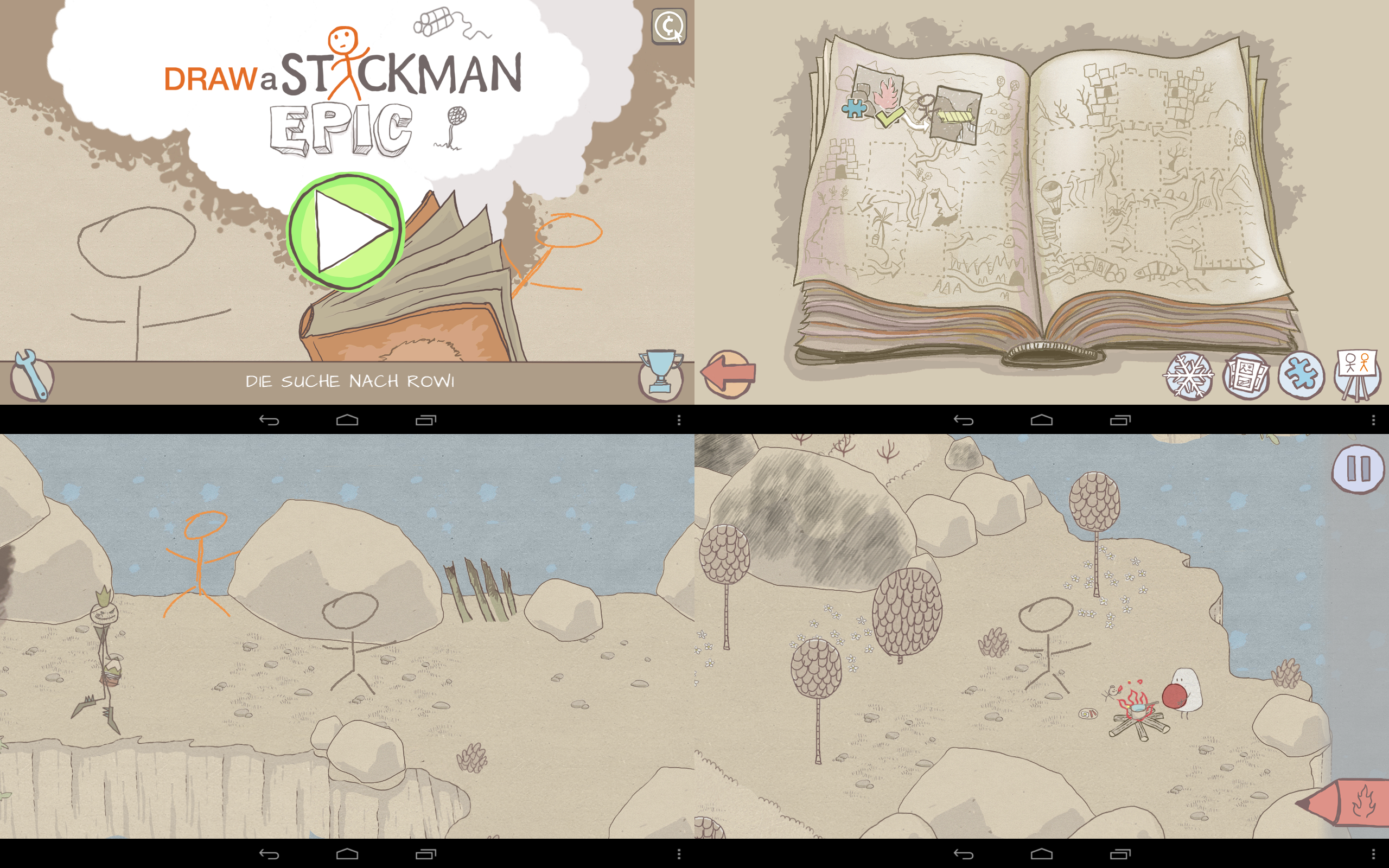 in Draw a Stickman: EPIC erleben die Strichmännchen nun ein Abenteuer auf dem Androiden. Am Anfang mal man zwei Strichmännchen auf dem Bildschirm. Das Eine wird daraufhin von einem aggresiven Buch angefallen und gefressen. Das andere Strichmännchen macht sich daraufhin auf seinen Freund aus dem Buch zu befreien. Stickman ist ein Adventure indem man ein selbst gezeichnetes Strichmännchen durch eine gezeichnete Landschaft führen muss. Praktisch alles was man als Hilfsmittel benötigt muss man sich selbst zeichnen, angefangen bei Feuer bis hin zu anderen Gegenständen.